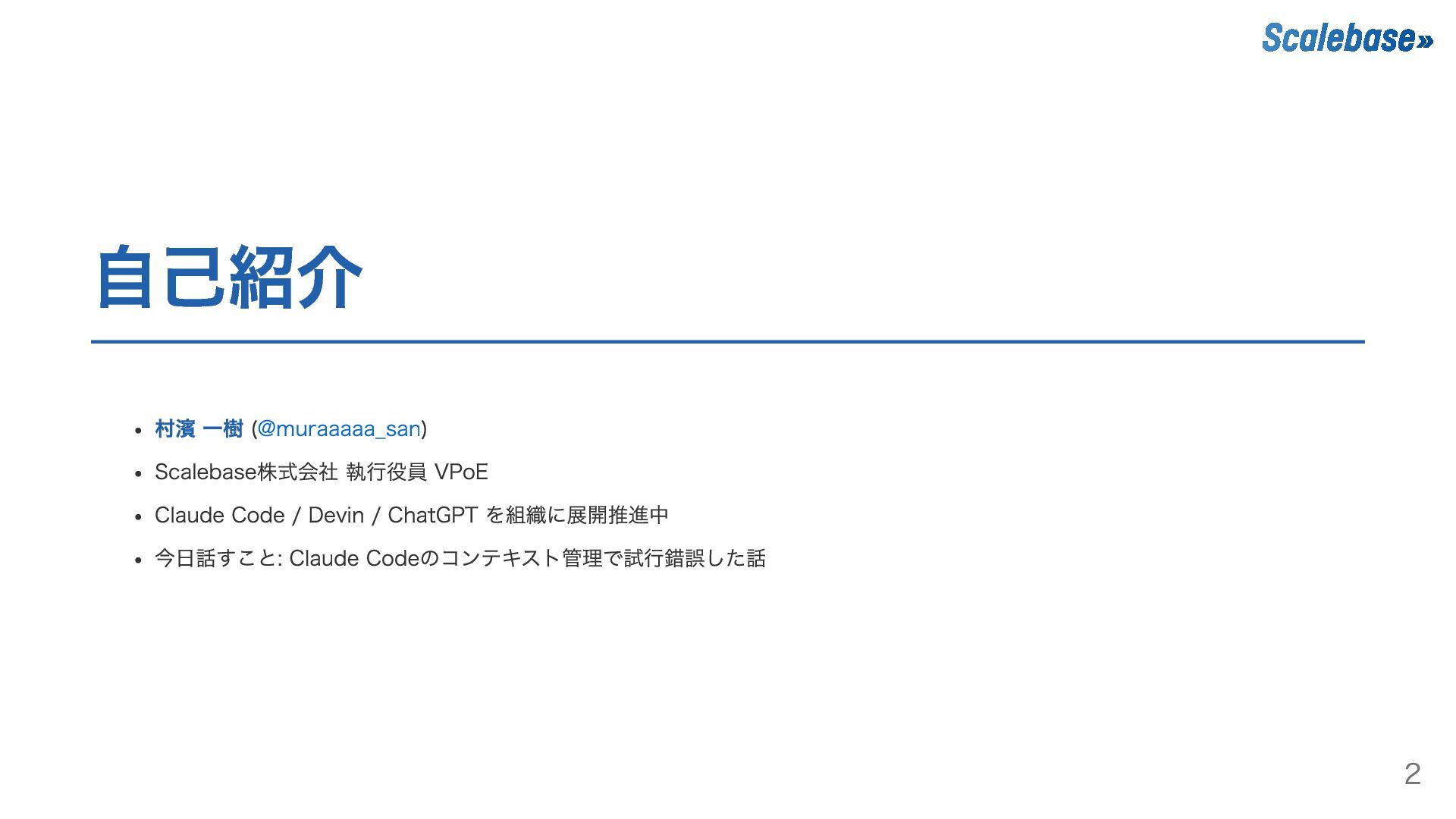 自己紹介 村濱 一樹 (@muraaaaa_san) Scalebase株式会社 執行役員 VPoE Claude Code /