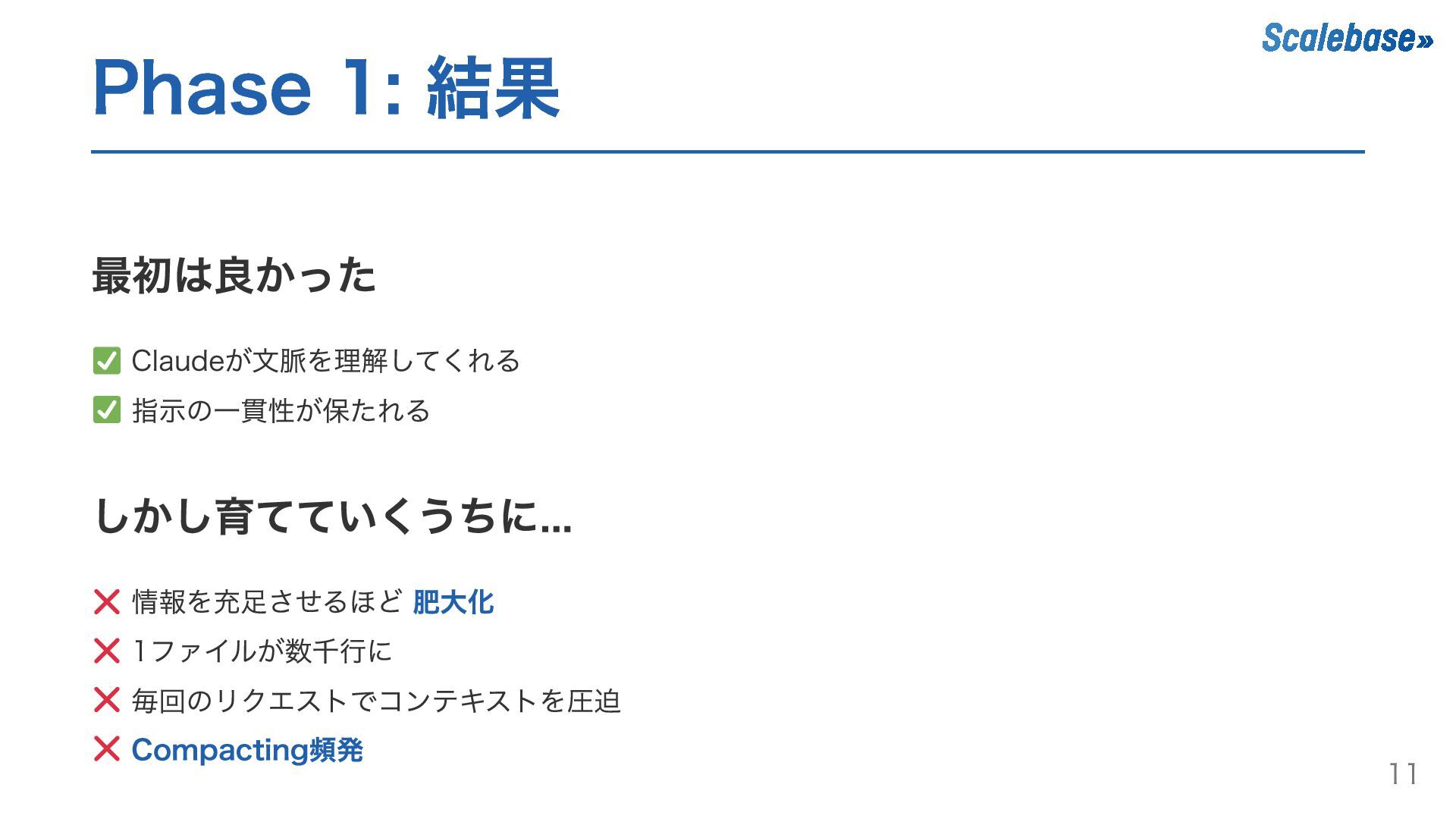 Phase 1: 結果 最初は良かった Claudeが文脈を理解してくれる 指示の一貫性が保たれる しかし育てていくうちに... 情報を充足させるほど 肥大化 1ファイルが数千行に