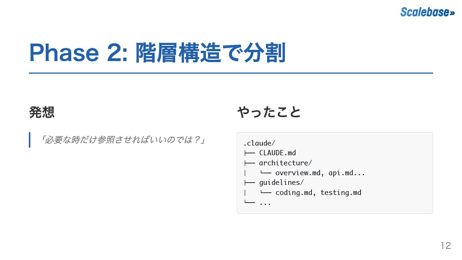 Phase 2: 階層構造で分割 発想 「必要な時だけ参照させればいいのでは?」 やったこと .claude/ ├── CLAUDE.md ├──