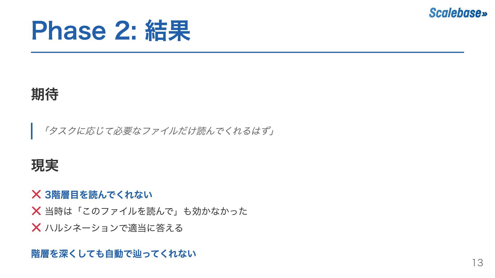 Phase 2: 結果 期待 「タスクに応じて必要なファイルだけ読んでくれるはず」 現実 3階層目を読んでくれない 当時は「このファイルを読んで」も効かなかった ハルシネーションで適当に答える 階層を深くしても自動で辿ってくれない