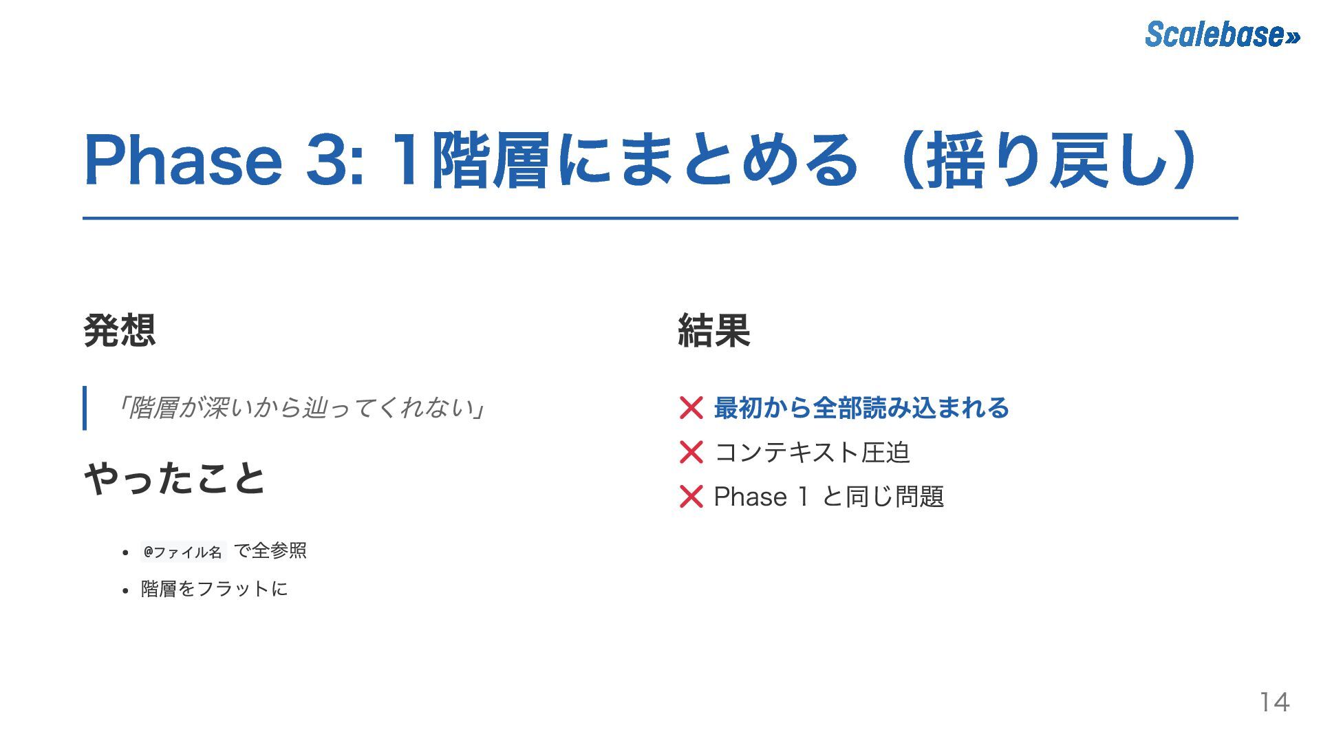 Phase 3: 1階層にまとめる(揺り戻し) 発想 「階層が深いから辿ってくれない」 やったこと @ファイル名 で全参照 階層をフラットに 結果