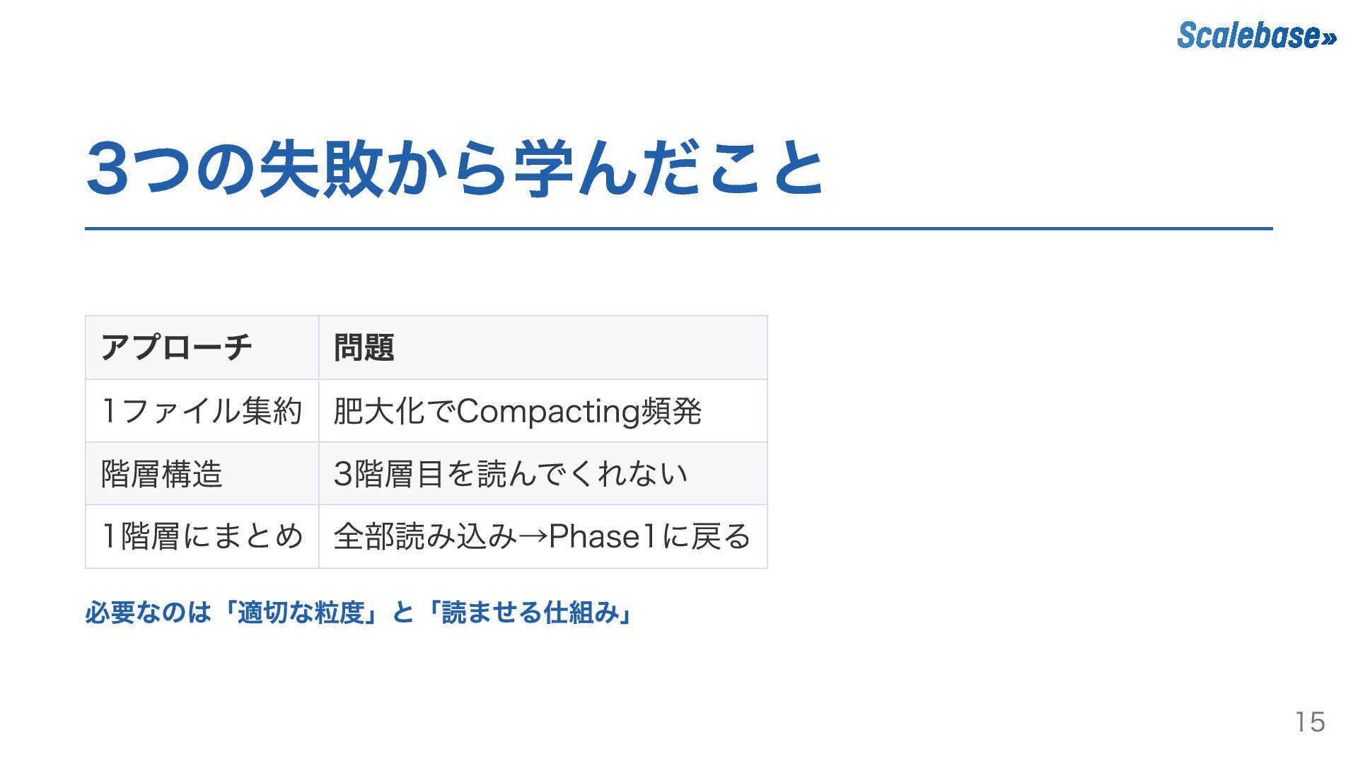 3つの失敗から学んだこと アプローチ 問題 1ファイル集約 肥大化でCompacting頻発 階層構造 3階層目を読んでくれない 1階層にまとめ 全部読み込み→Phase1に戻る 必要なのは「適切な粒度」と「読ませる仕組み」