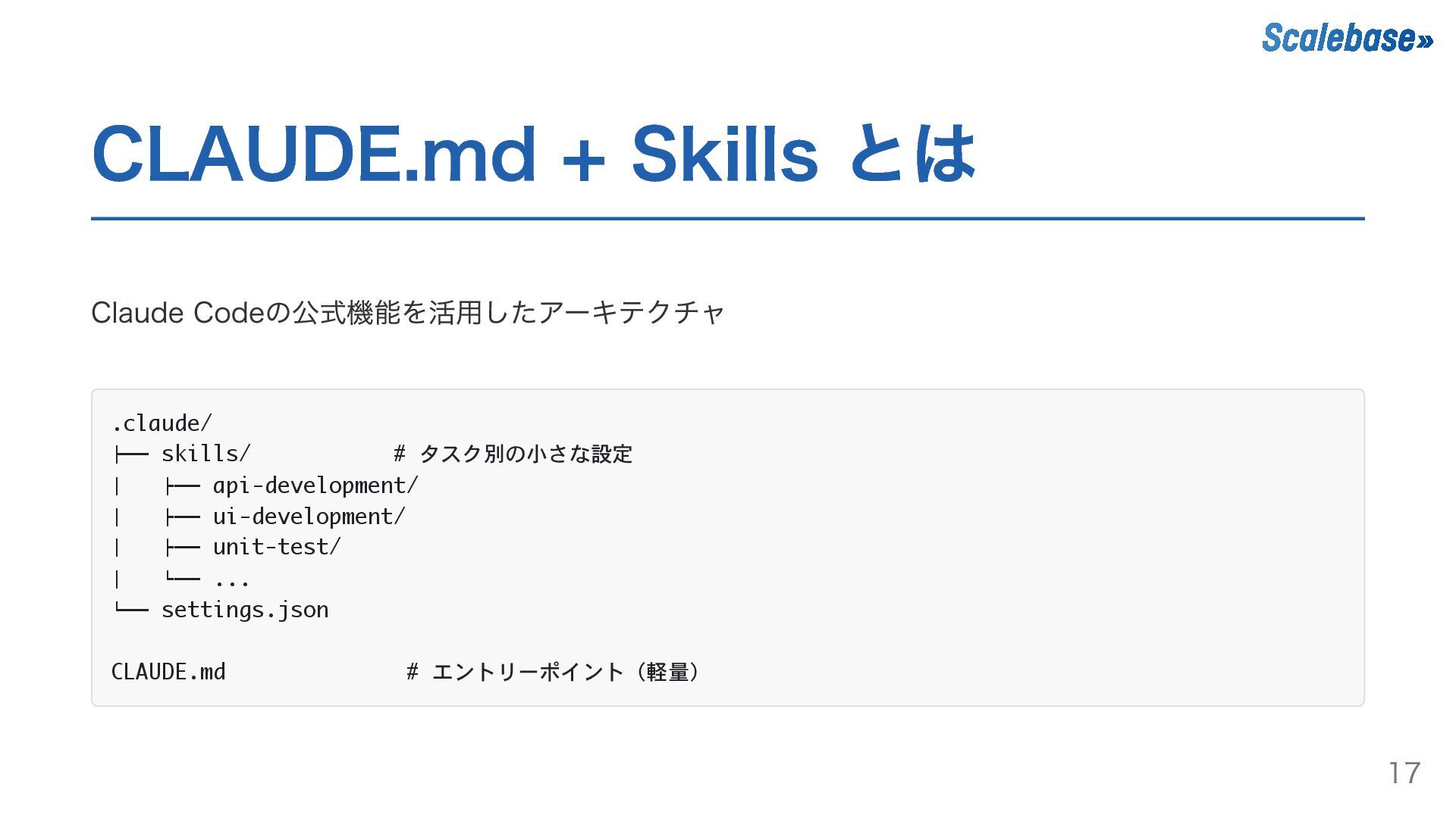 CLAUDE.md + Skills とは Claude Codeの公式機能を活用したアーキテクチャ .claude/ ├── skills/ #