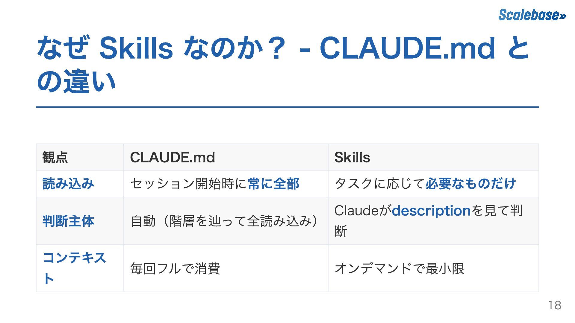なぜ Skills なのか? - CLAUDE.md と の違い 観点 CLAUDE.md Skills