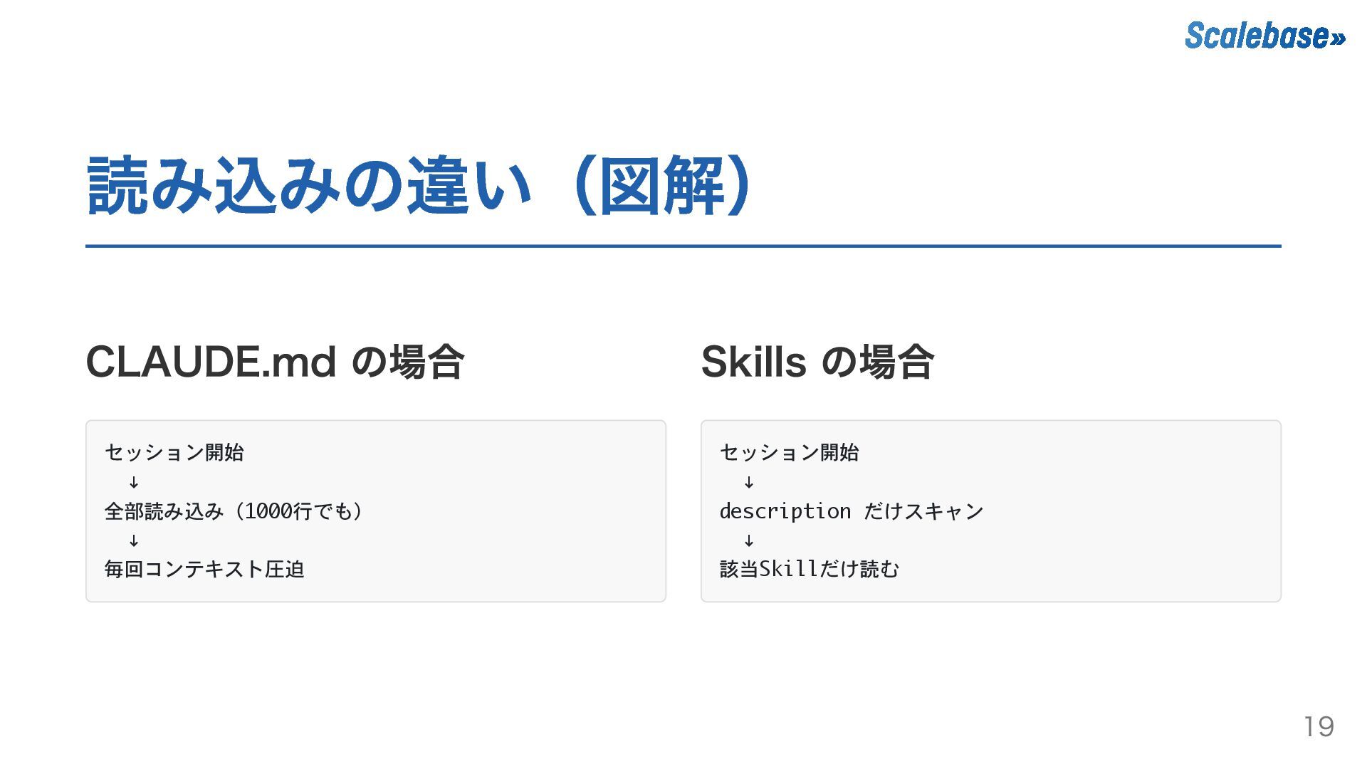 読み込み セッション開始時に常に全部 タスクに応じて必要なものだけ 判断主体 自動(階層を辿って全読み込み) Claudeがdescriptionを見て判 断 コンテキス ト 毎回フルで消費 オンデマンドで最小限 18