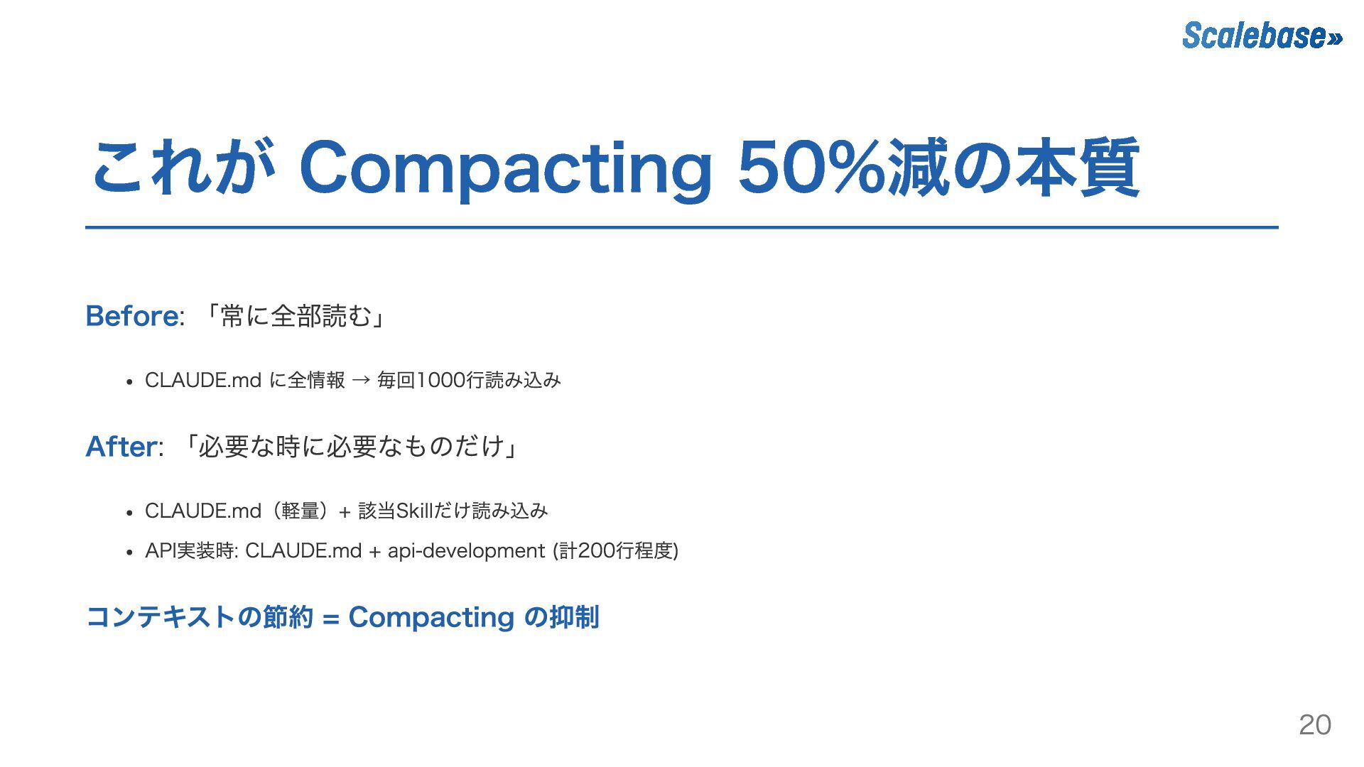 これが Compacting 50%減の本質 Before: 「常に全部読む」 CLAUDE.md に全情報 → 毎回1000行読み込み After:
