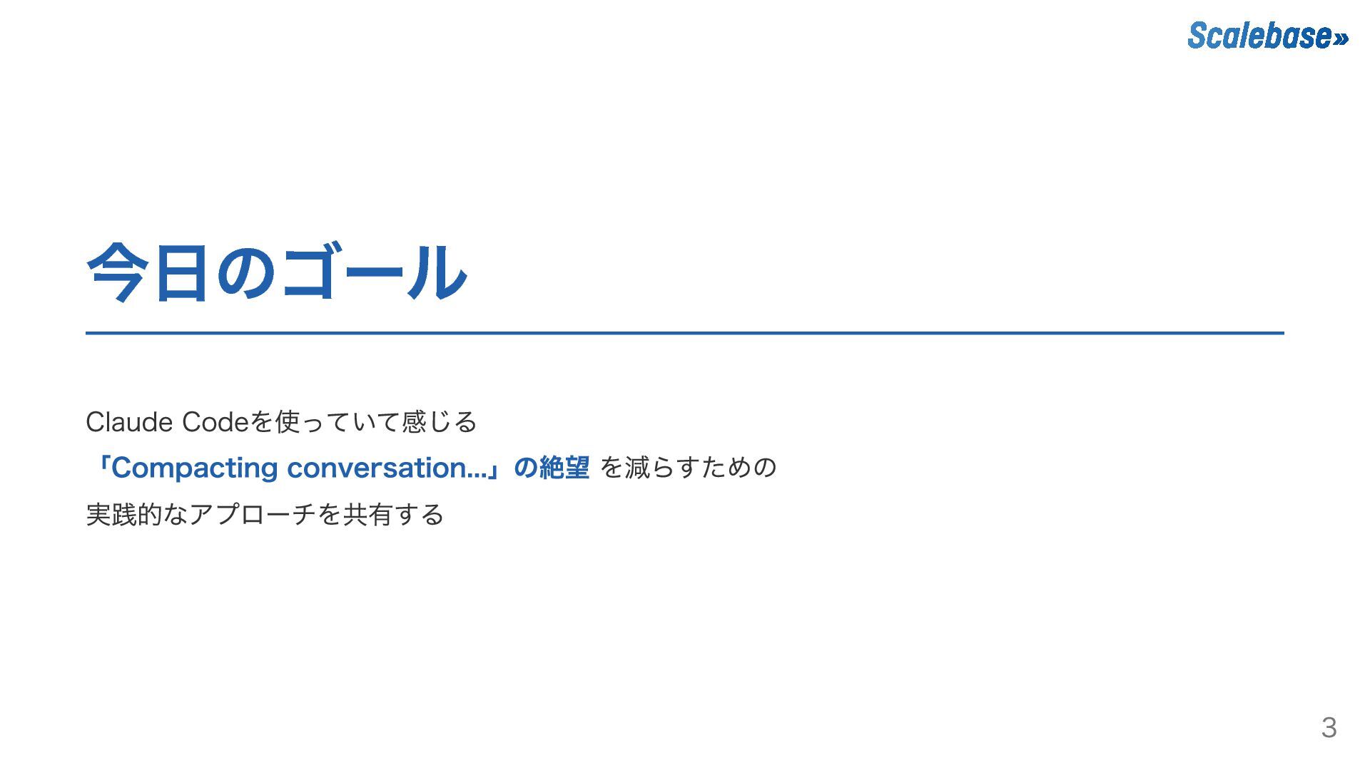 今日のゴール Claude Codeを使っていて感じる 「Compacting conversation...」の絶望 を減らすための 実践的なアプローチを共有する 3
