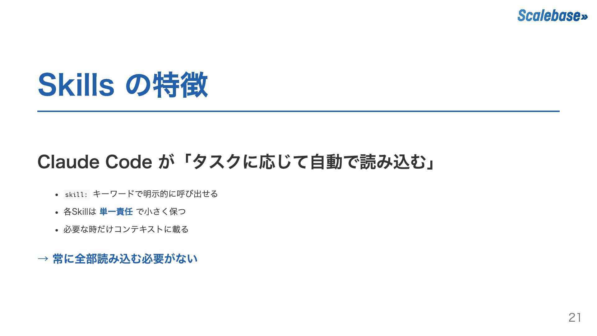 Skills の特徴 Claude Code が「タスクに応じて自動で読み込む」 skill: キーワードで明示的に呼び出せる 各Skillは 単一責任 で小さく保つ