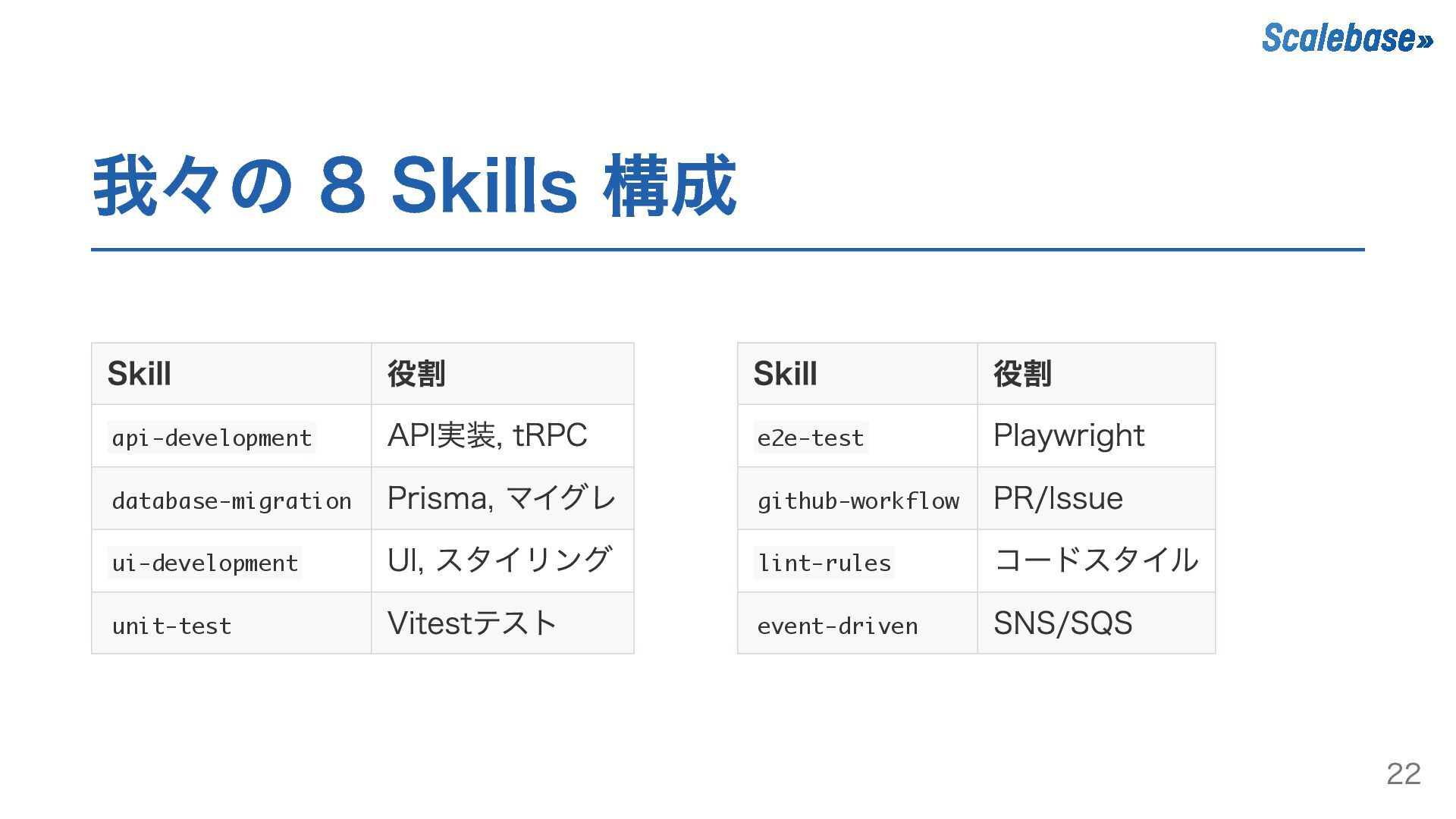 Prisma, マイグレ ui-development UI, スタイリング unit-test Vitestテスト Skill 役割 e2e-test Playwright github-workflow PR/Issue lint-rules コードスタイル event-driven SNS/SQS 22