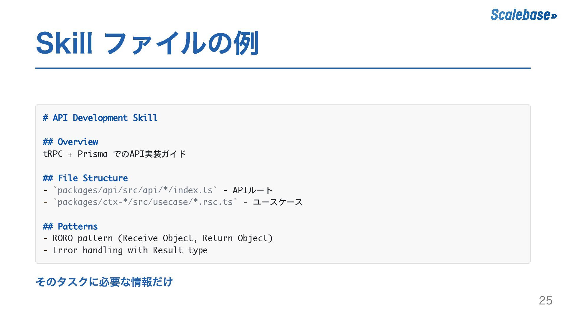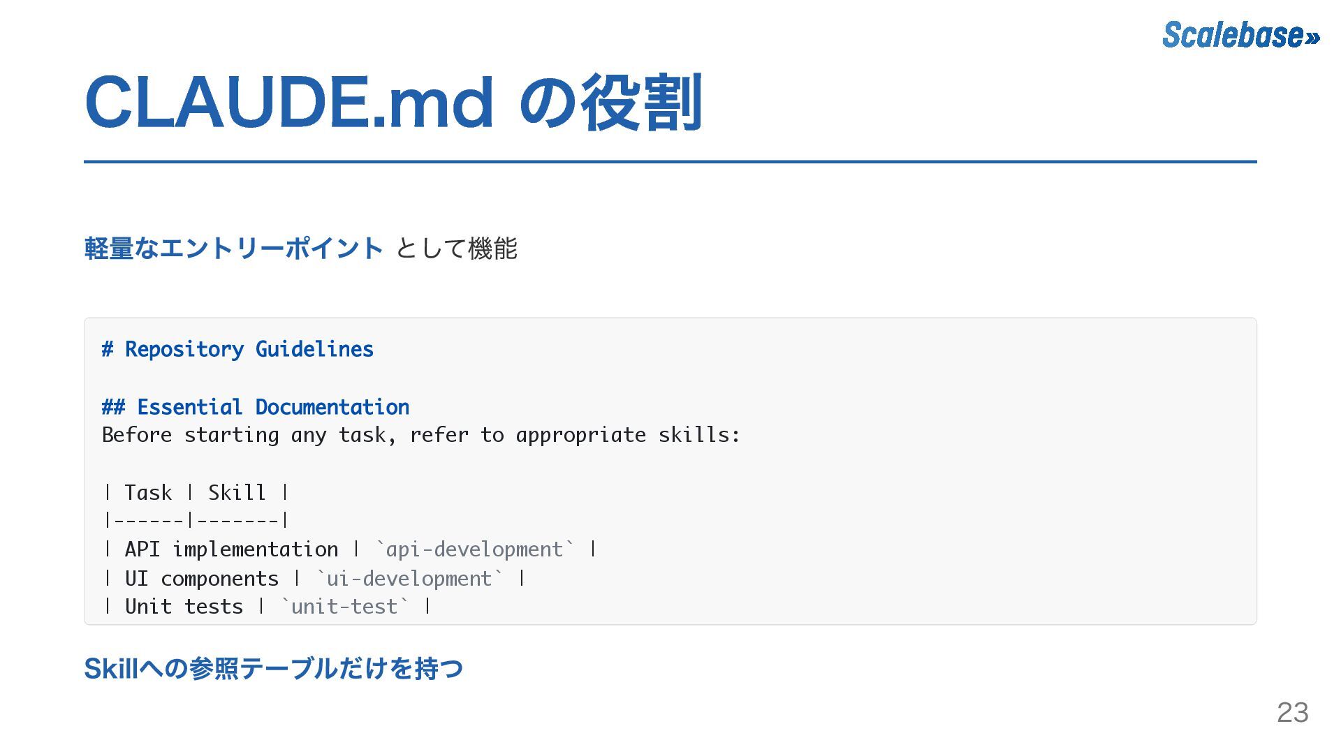 Before starting any task, refer to appropriate skills: | Task | Skill | |------|-------| | API implementation | `api-development` | | UI components | `ui-development` | | Unit tests | `unit-test` | Skillへの参照テーブルだけを持つ 23