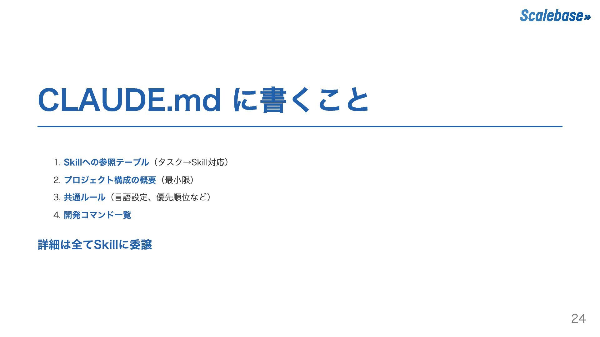 CLAUDE.md に書くこと 1. Skillへの参照テーブル(タスク→Skill対応) 2. プロジェクト構成の概要(最小限) 3. 共通ルール(言語設定、優先順位など) 4. 開発コマンド一覧