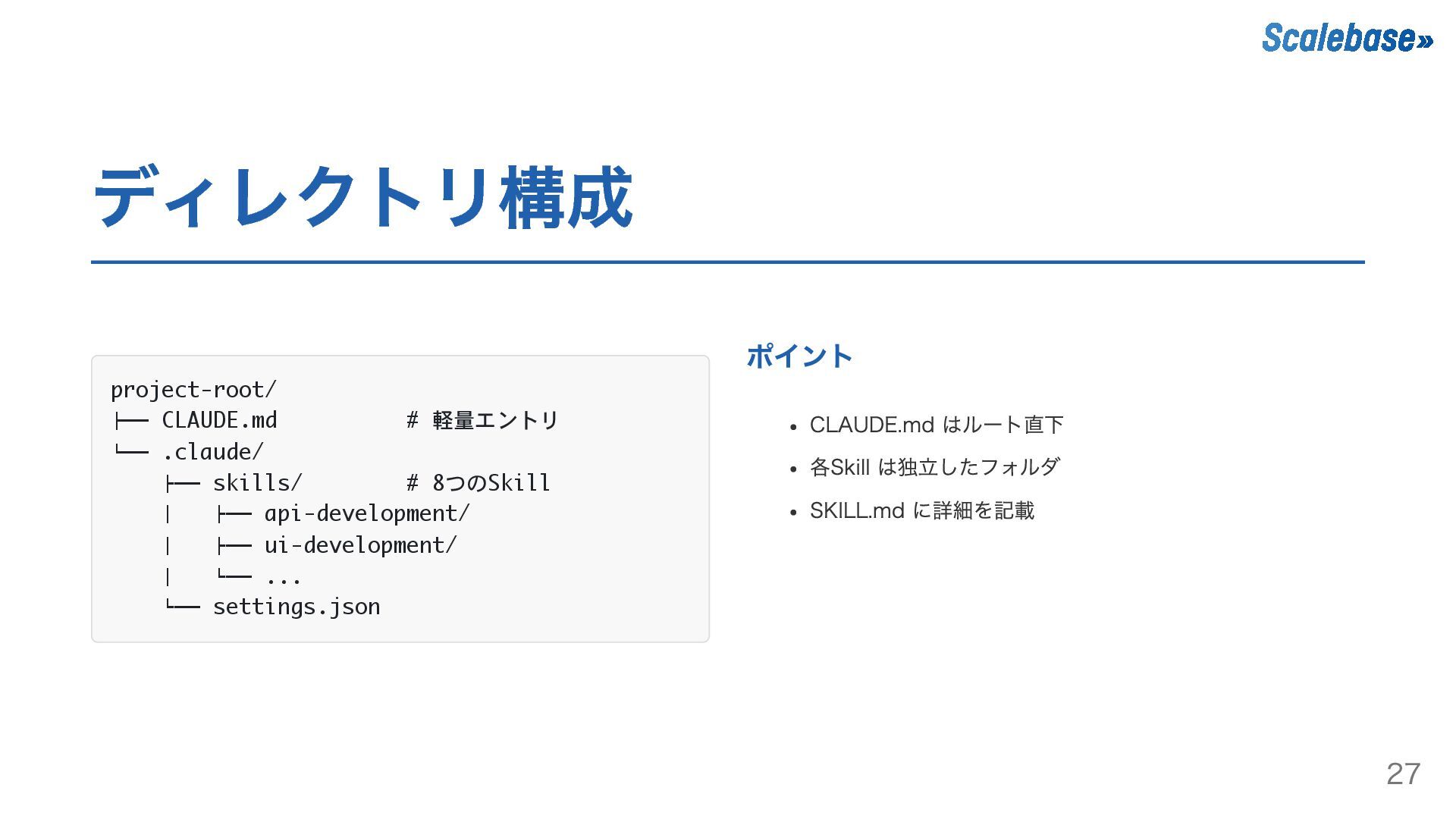 # 8つのSkill │ ├── api-development/ │ ├── ui-development/ │ └── ... └── settings.json ポイント CLAUDE.md はルート直下 各Skill は独立したフォルダ SKILL.md に詳細を記載 27