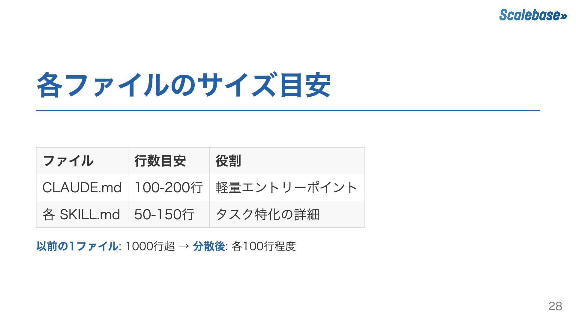 各ファイルのサイズ目安 ファイル 行数目安 役割 CLAUDE.md 100-200行 軽量エントリーポイント 各 SKILL.md 50-150行