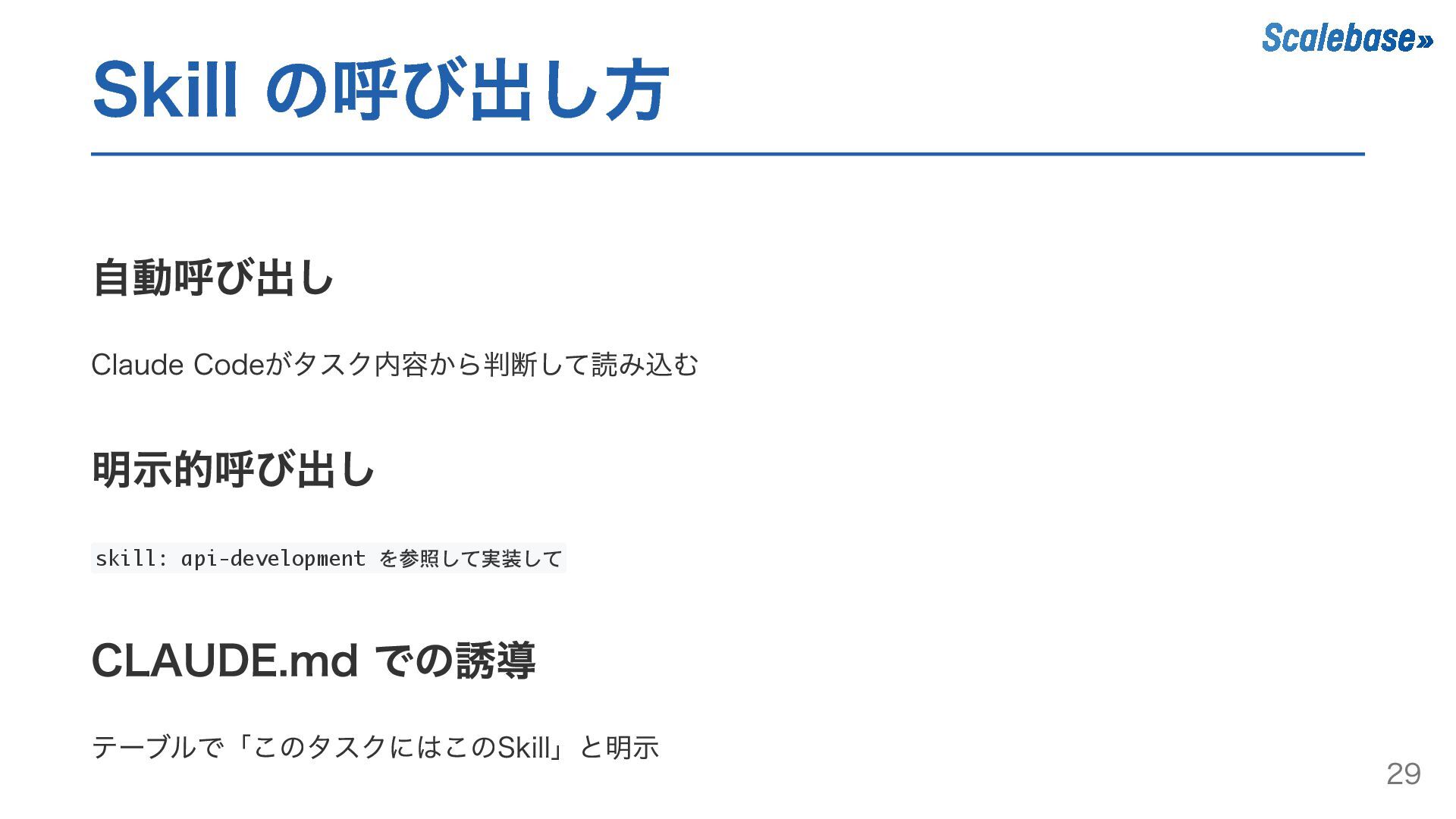Skill の呼び出し方 自動呼び出し Claude Codeがタスク内容から判断して読み込む 明示的呼び出し skill: api-development を参照して実装して CLAUDE.md