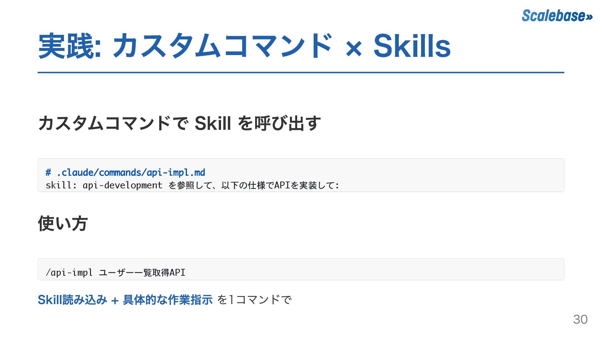 実践: カスタムコマンド × Skills カスタムコマンドで Skill を呼び出す # .claude/commands/api-impl.md skill: