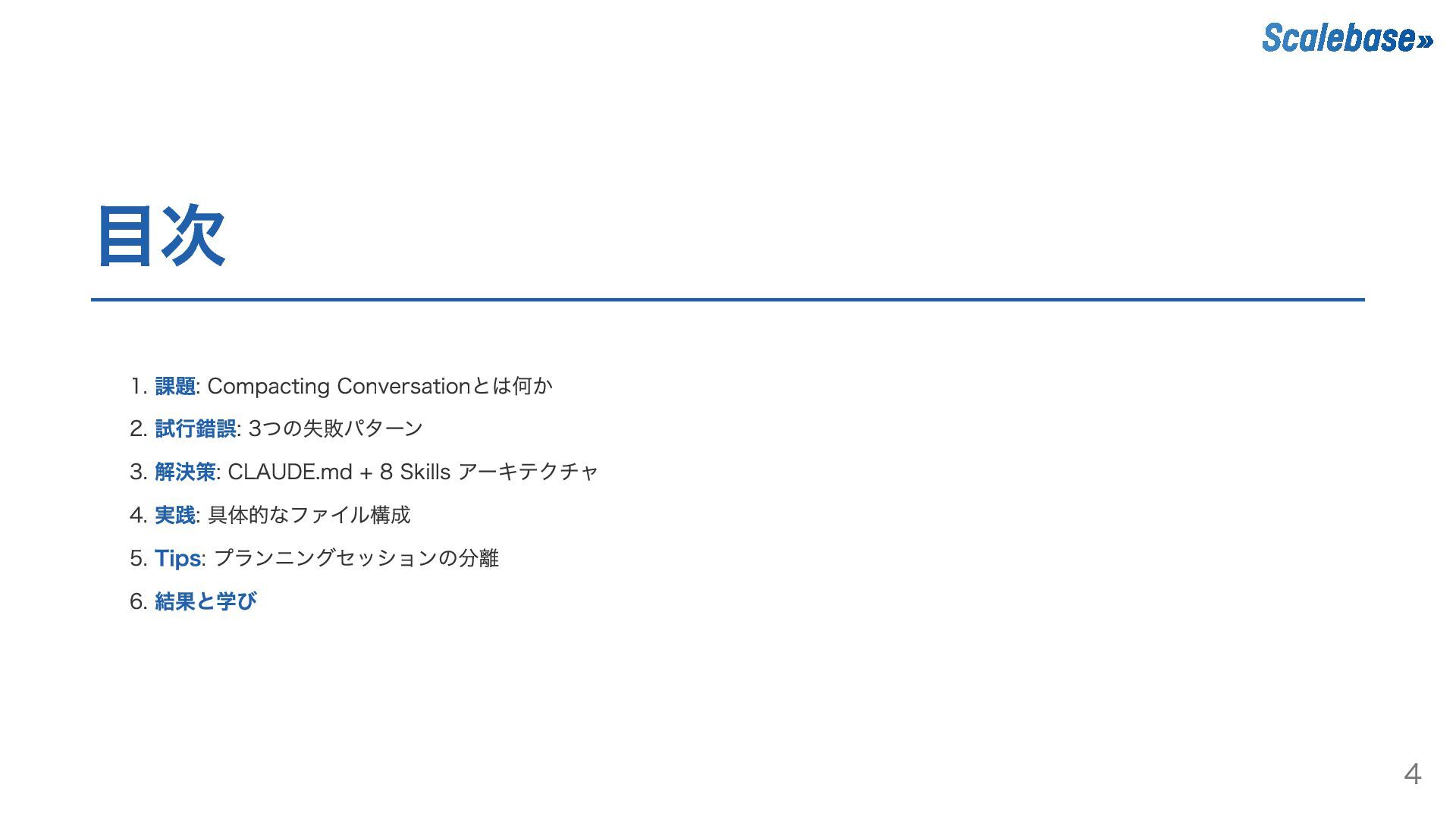 CLAUDE.md + 8 Skills アーキテクチャ 4. 実践: 具体的なファイル構成 5. Tips: プランニングセッションの分離 6. 結果と学び 4