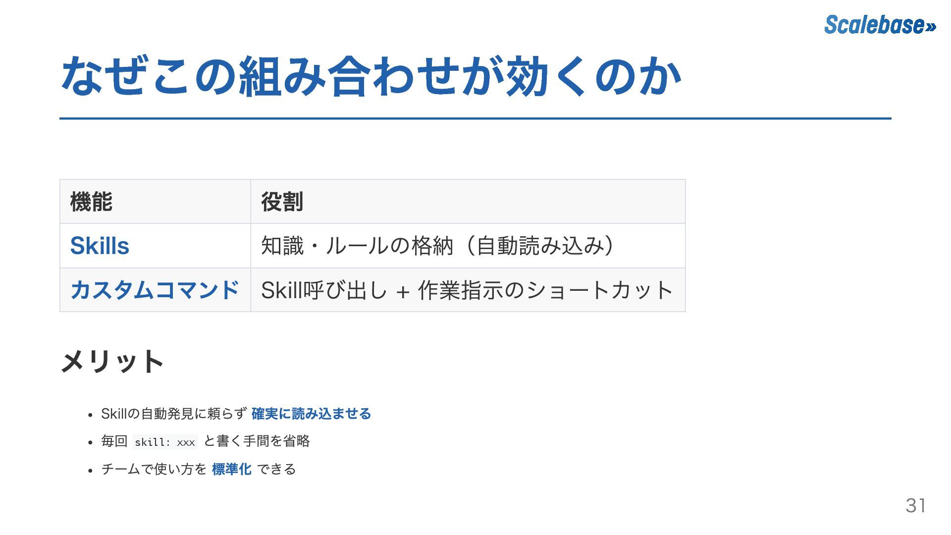 Skillの自動発見に頼らず 確実に読み込ませる 毎回 skill: xxx と書く手間を省略 チームで使い方を 標準化 できる 31