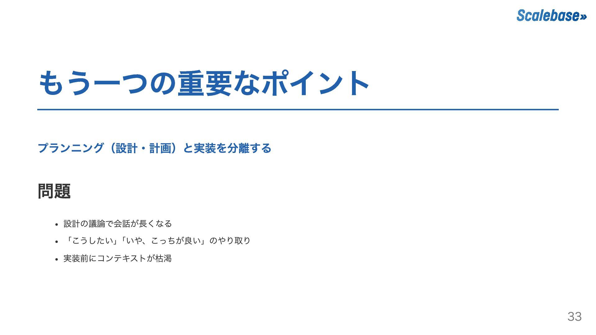 もう一つの重要なポイント プランニング(設計・計画)と実装を分離する 問題 設計の議論で会話が長くなる 「こうしたい」 「いや、こっちが良い」のやり取り 実装前にコンテキストが枯渇 33