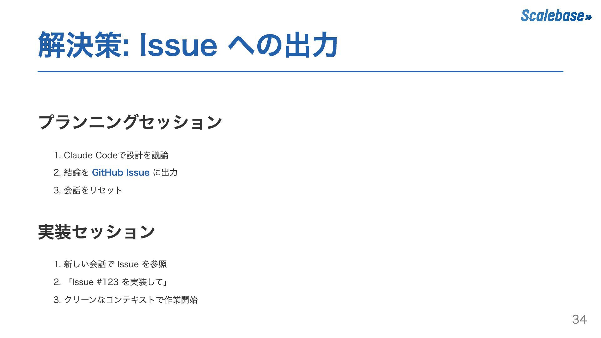 Issue に出力 3. 会話をリセット 実装セッション 1. 新しい会話で Issue を参照 2. 「Issue #123 を実装して」 3. クリーンなコンテキストで作業開始 34