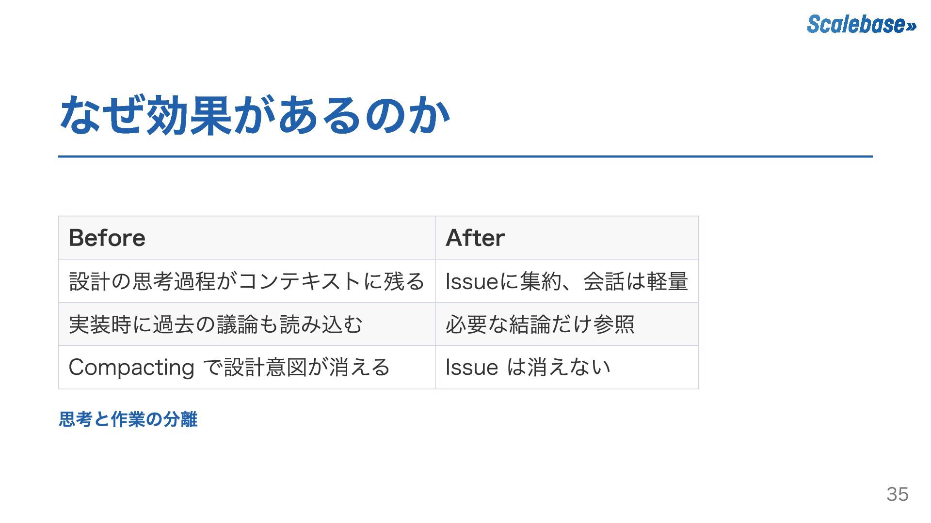 なぜ効果があるのか Before After 設計の思考過程がコンテキストに残る Issueに集約、会話は軽量 実装時に過去の議論も読み込む 必要な結論だけ参照 Compacting で設計意図が消える Issue