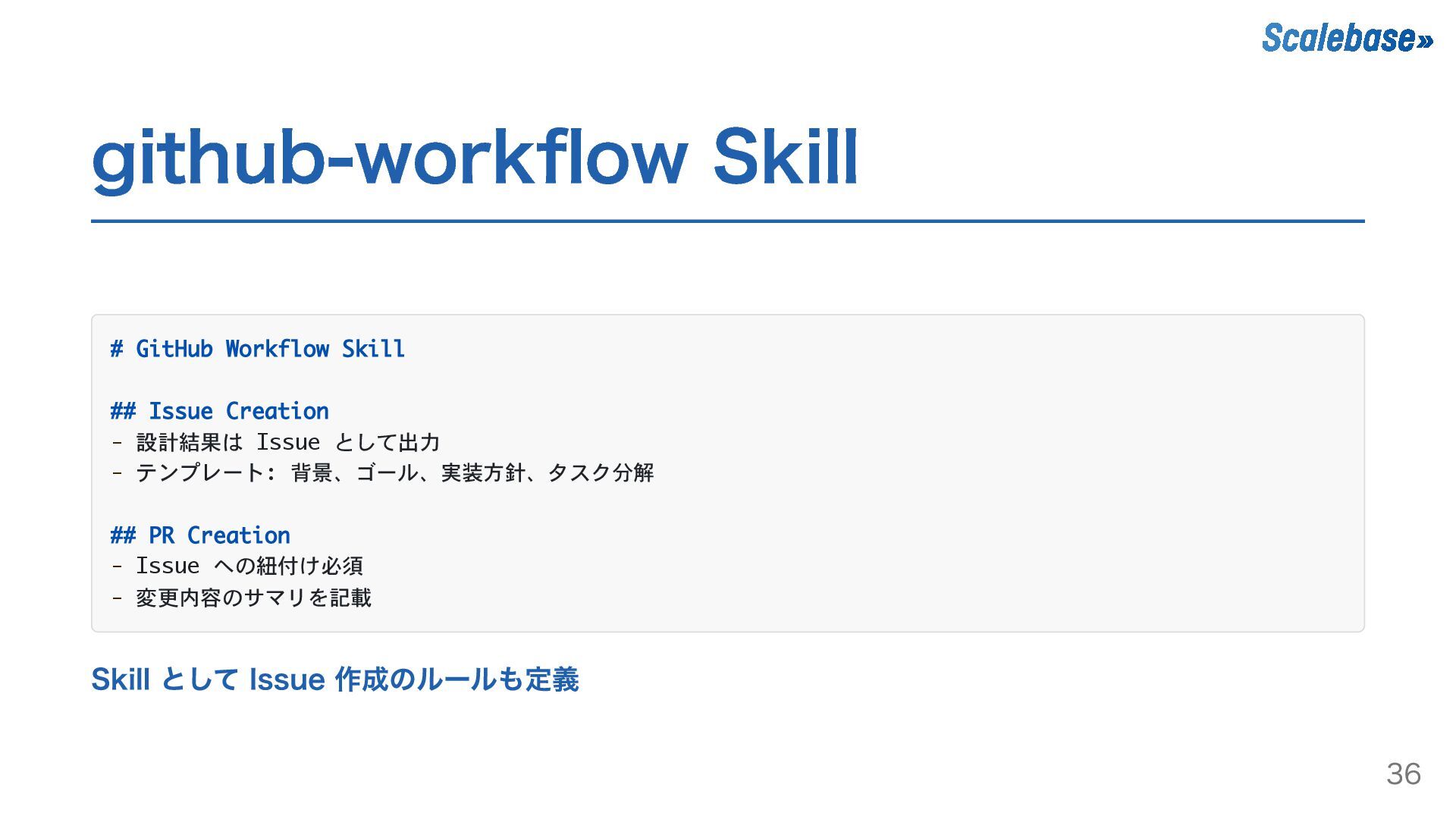 設計結果は Issue として出力 - テンプレート: 背景、ゴール、実装方針、タスク分解 ## PR Creation - Issue への紐付け必須 - 変更内容のサマリを記載 Skill として Issue 作成のルールも定義 36