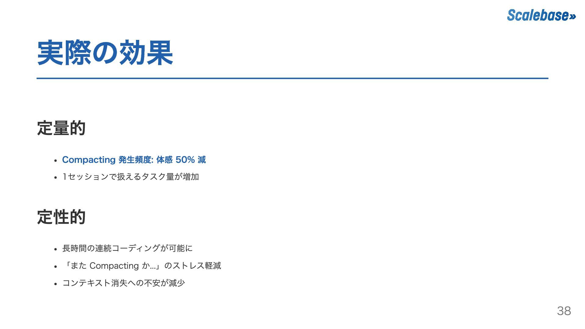 実際の効果 定量的 Compacting 発生頻度: 体感 50% 減 1セッションで扱えるタスク量が増加 定性的 長時間の連続コーディングが可能に