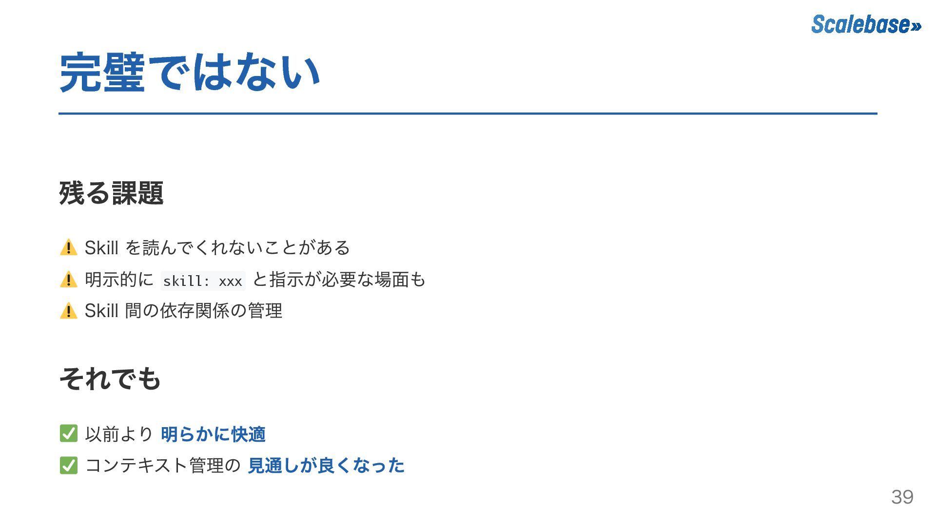 完璧ではない 残る課題 Skill を読んでくれないことがある 明示的に skill: xxx と指示が必要な場面も Skill 間の依存関係の管理