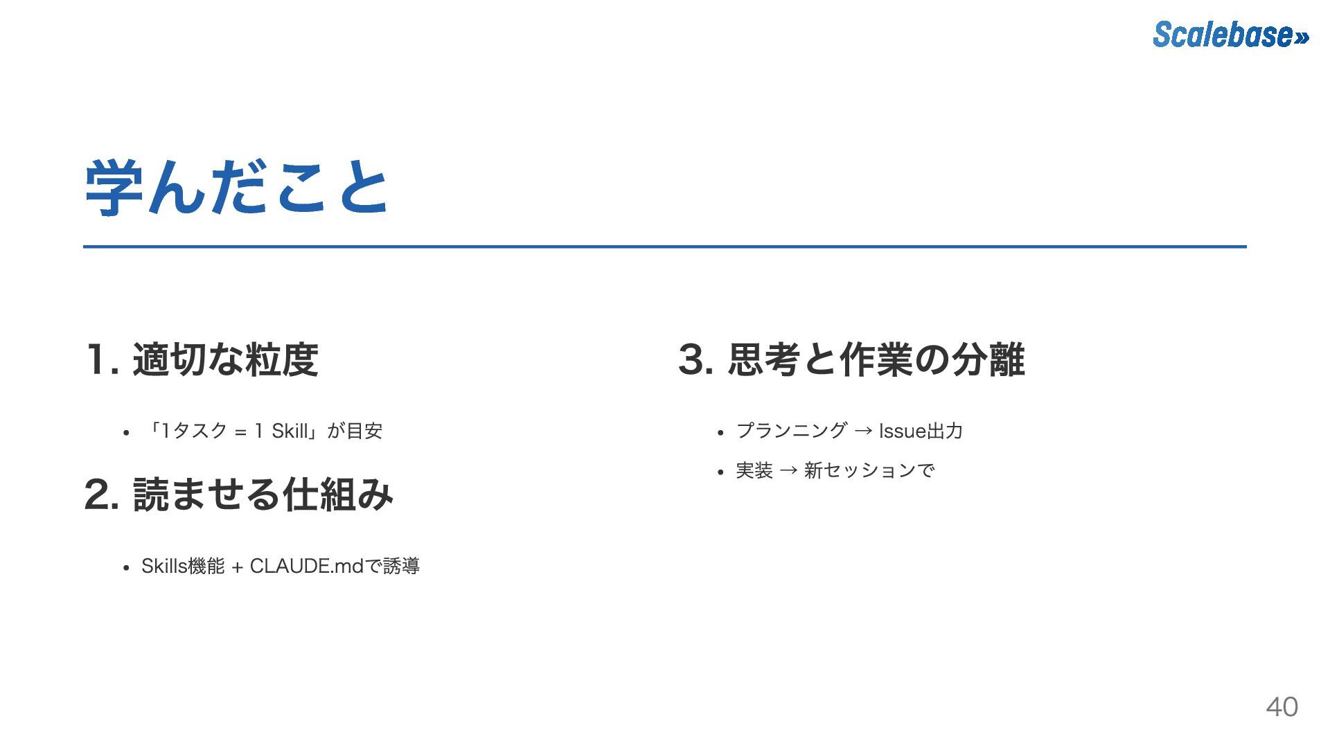 + CLAUDE.mdで誘導 3. 思考と作業の分離 プランニング → Issue出力 実装 → 新セッションで 40