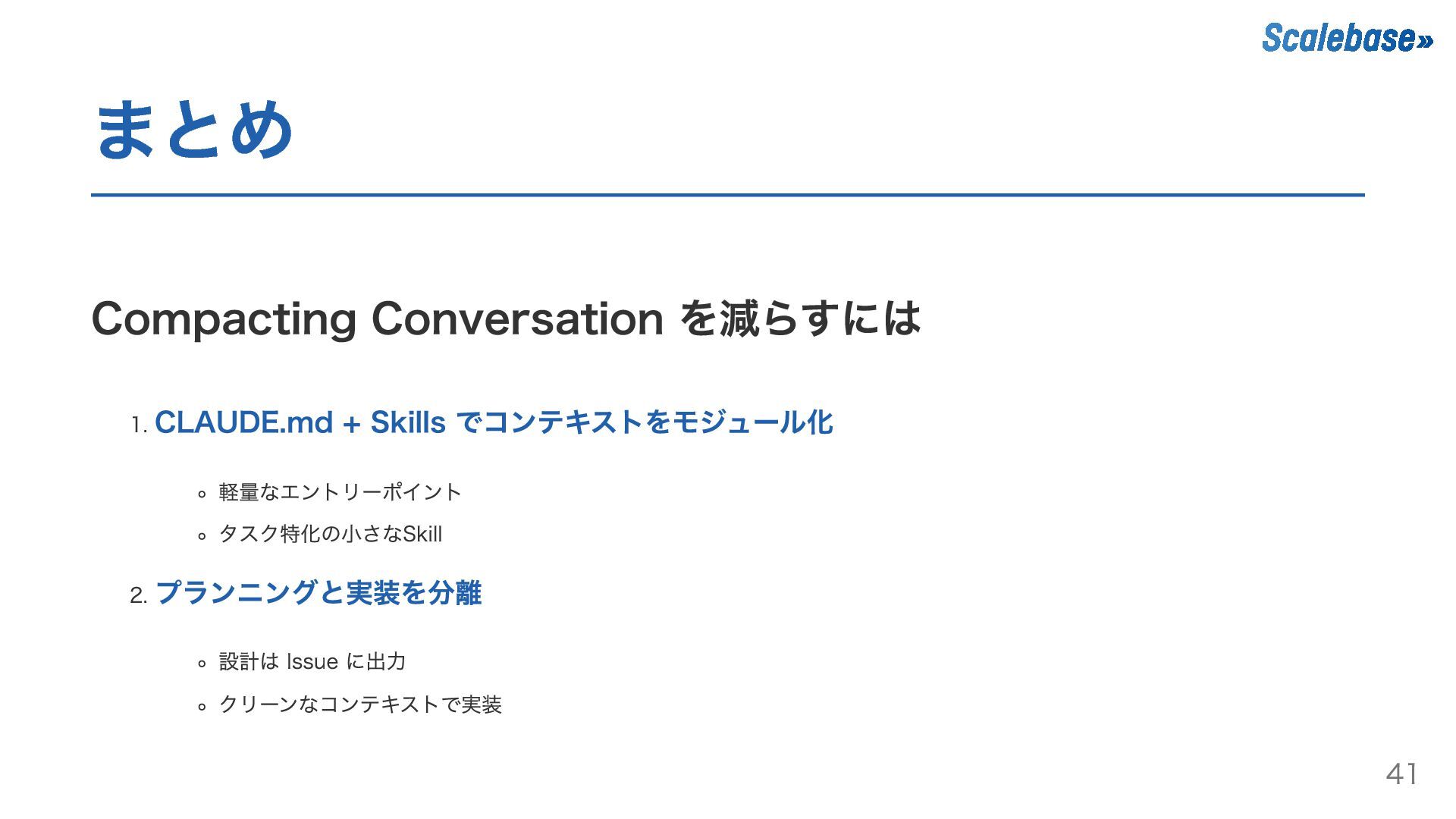 まとめ Compacting Conversation を減らすには 1. CLAUDE.md + Skills でコンテキストをモジュール化 軽量なエントリーポイント