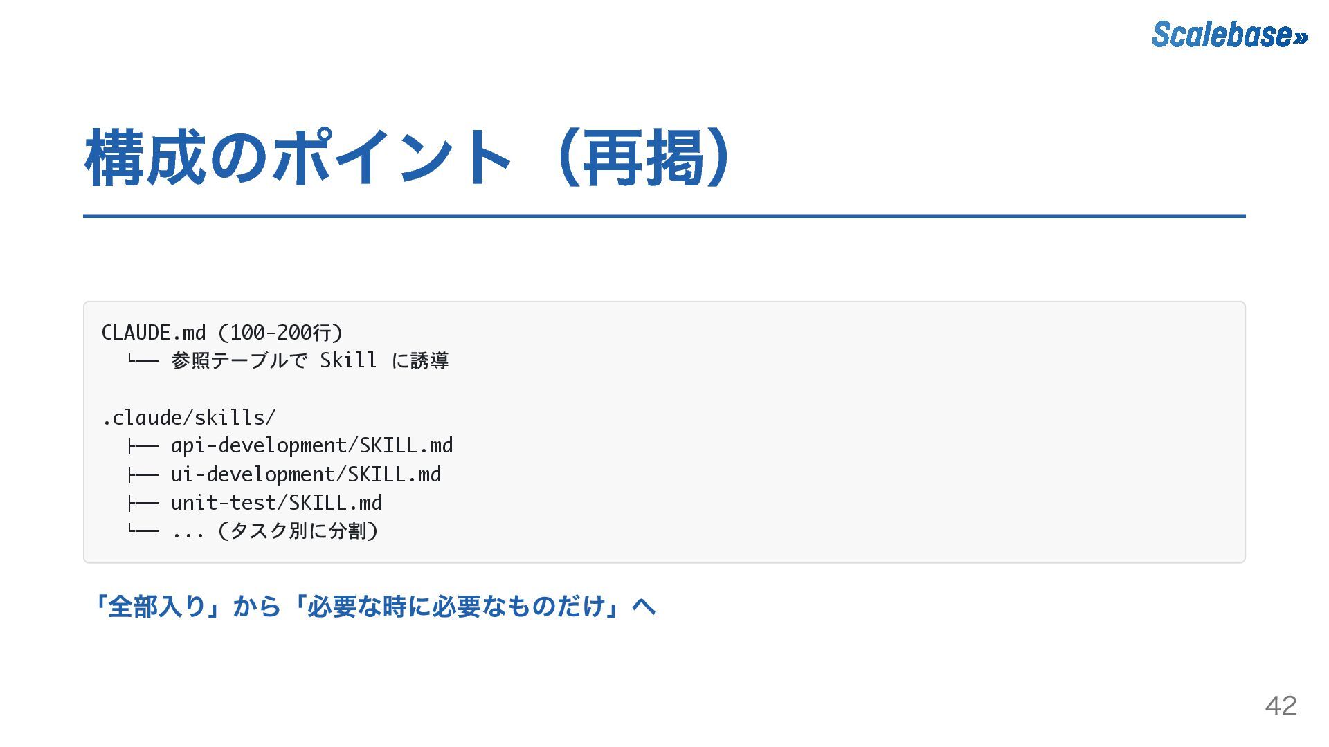 ├── ui-development/SKILL.md ├── unit-test/SKILL.md └── ... (タスク別に分割) 「全部入り」から「必要な時に必要なものだけ」へ 42