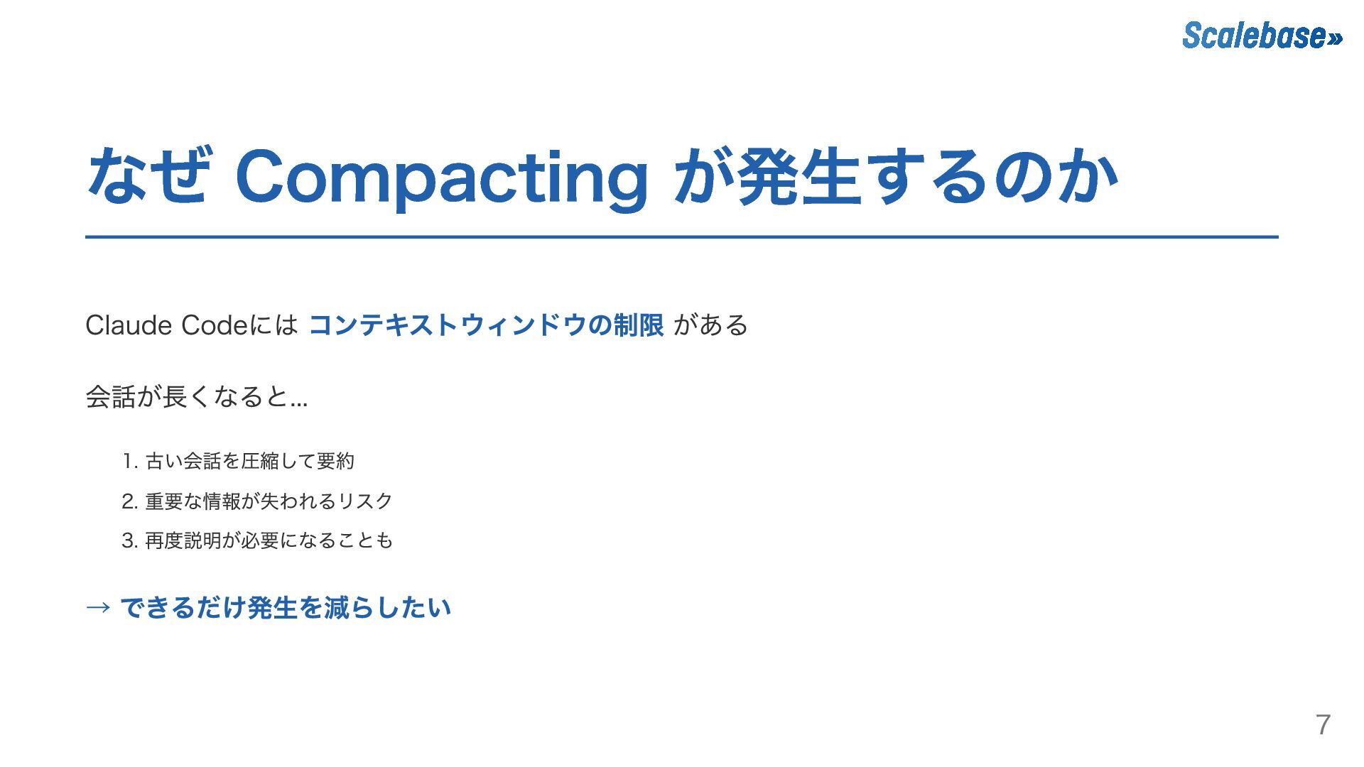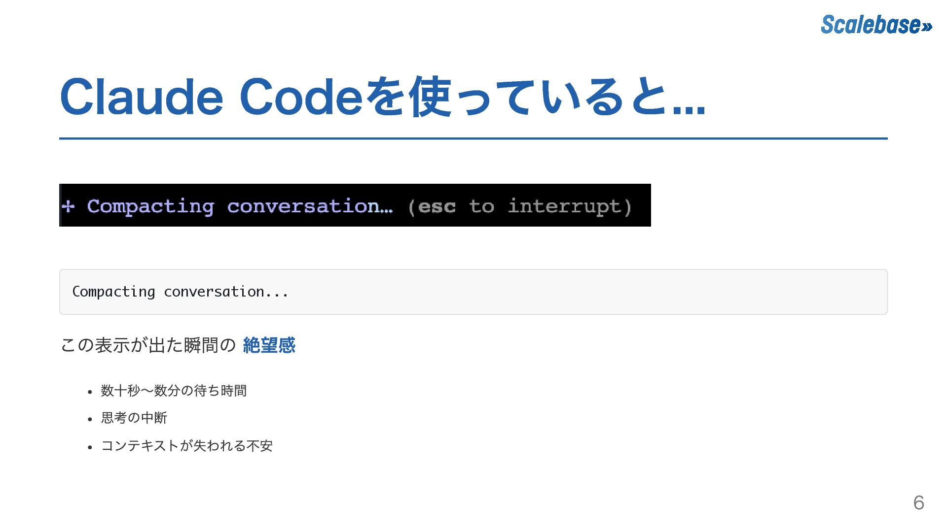 Claude Codeを使っていると... Compacting conversation... この表示が出た瞬間の 絶望感 数十秒〜数分の待ち時間 思考の中断 コンテキストが失われる不安 6