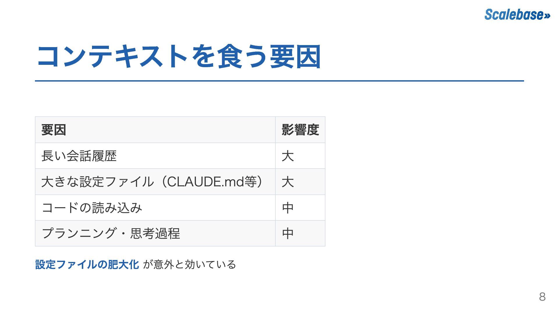 コンテキストを食う要因 要因 影響度 長い会話履歴 大 大きな設定ファイル(CLAUDE.md等) 大 コードの読み込み 中 プランニング・思考過程