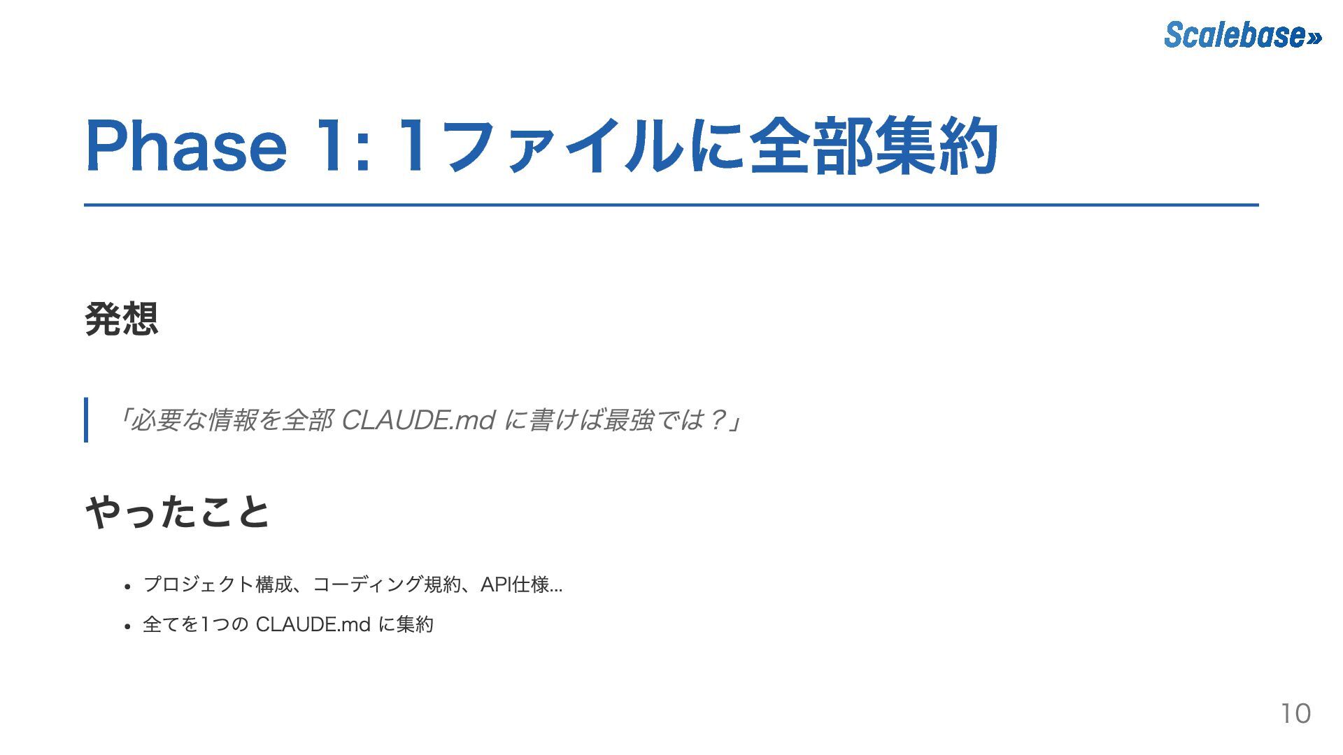 Phase 1: 1ファイルに全部集約 発想 「必要な情報を全部 CLAUDE.md に書けば最強では?」 やったこと プロジェクト構成、コーディング規約、API仕様... 全てを1つの