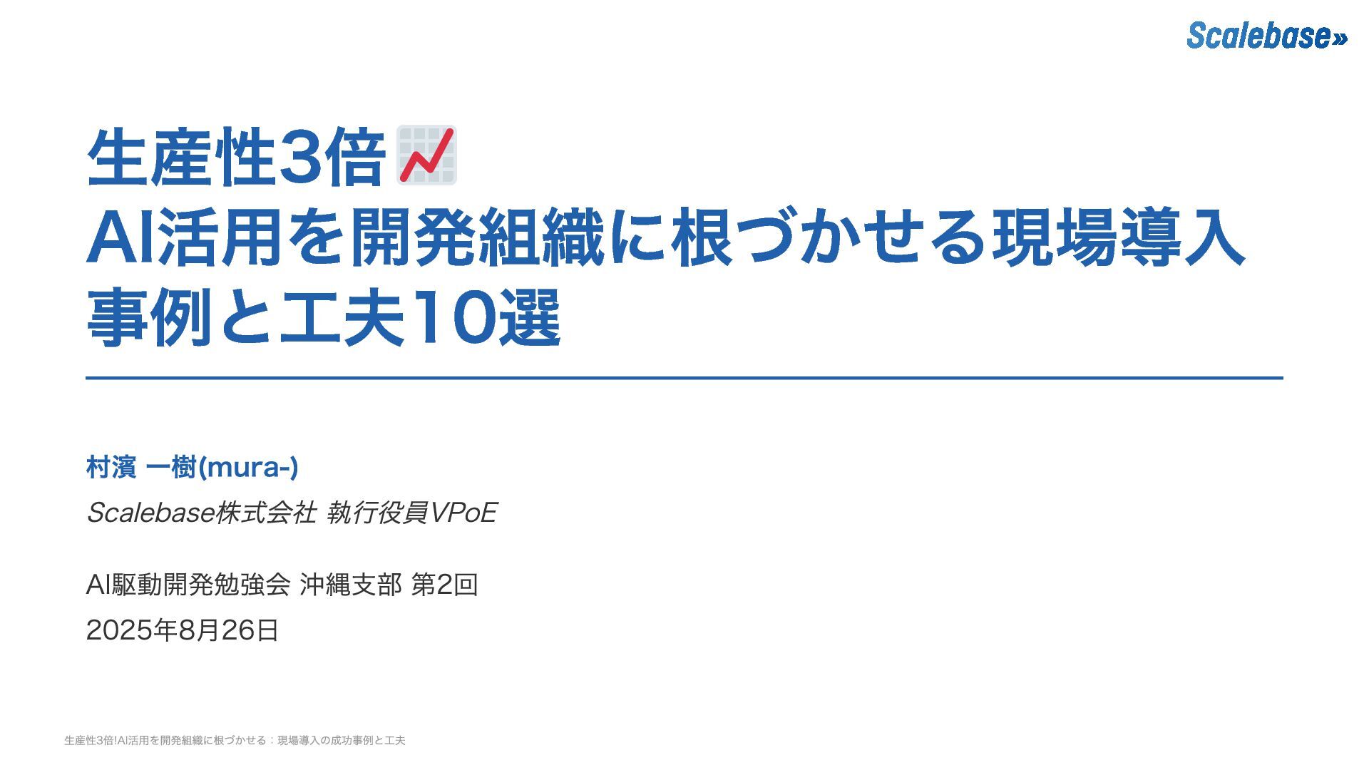 生産性3倍 AI活用を開発組織に根づかせる現場導入 事例と工夫10選 村濱 一樹(mura-) Scalebase株式会社 執行役員VPoE AI駆動開発勉強会 沖縄支部 第2回