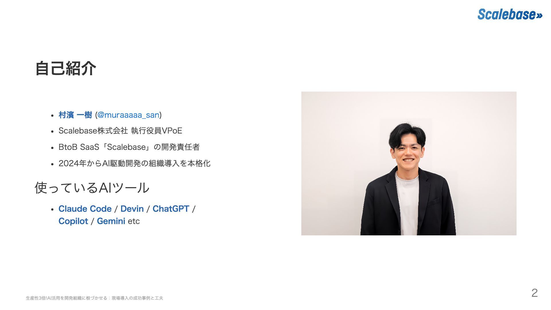 自己紹介 村濱 一樹 (@muraaaaa_san) Scalebase株式会社 執行役員VPoE BtoB SaaS「Scalebase」の開発責任者 2024年からAI駆動開発の組織導入を本格化 使っているAIツール