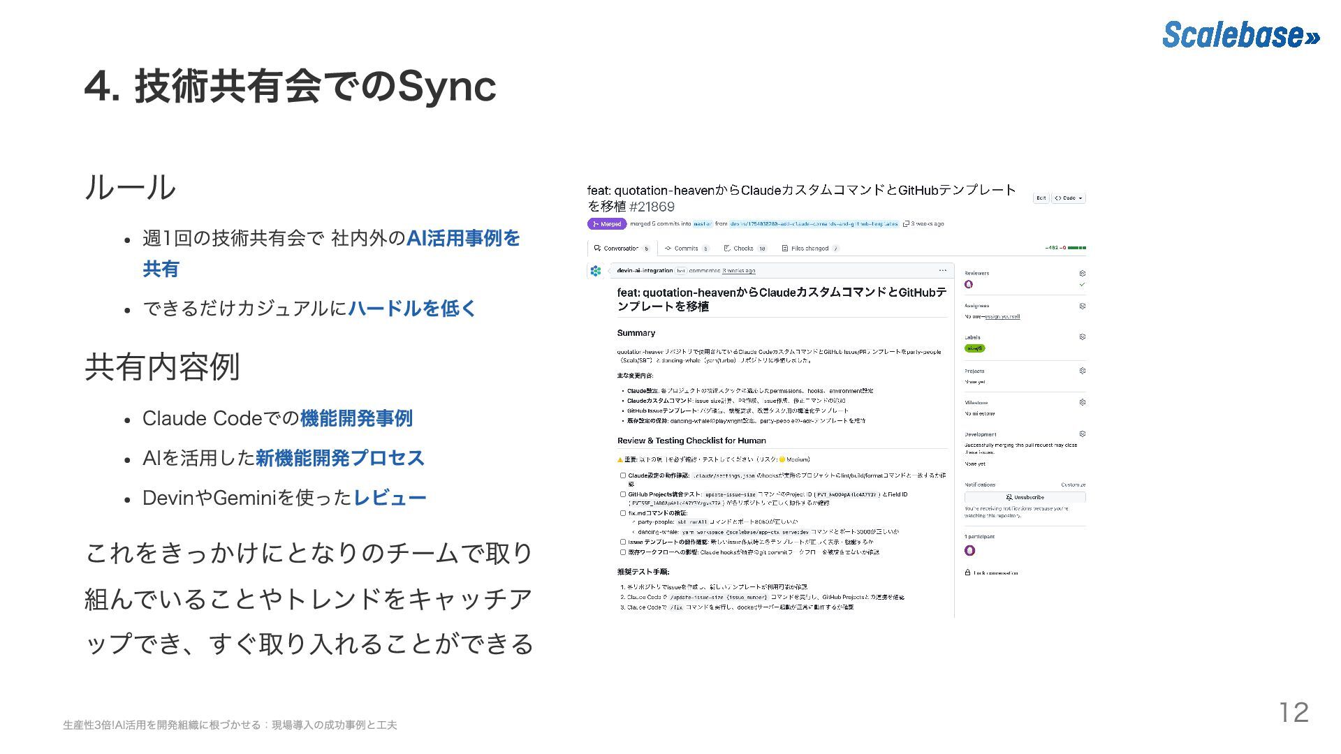 AIを活用した新機能開発プロセス DevinやGeminiを使ったレビュー これをきっかけにとなりのチームで取り 組んでいることやトレンドをキャッチア ップでき、すぐ取り入れることができる 生産性3倍!AI活用を開発組織に根づかせる:現場導入の成功事例と工夫 12