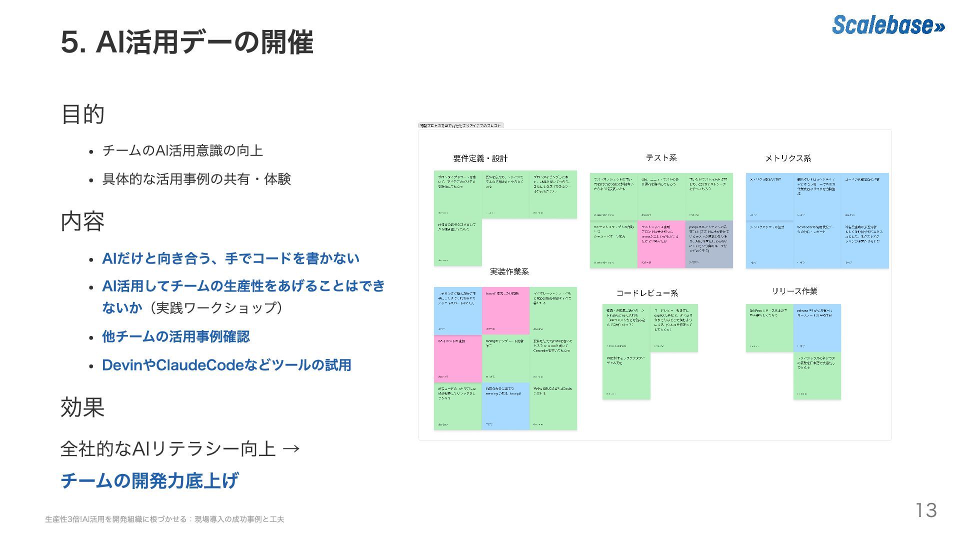 DevinやClaudeCodeなどツールの試用 効果 全社的なAIリテラシー向上 → チームの開発力底上げ 生産性3倍!AI活用を開発組織に根づかせる:現場導入の成功事例と工夫 13