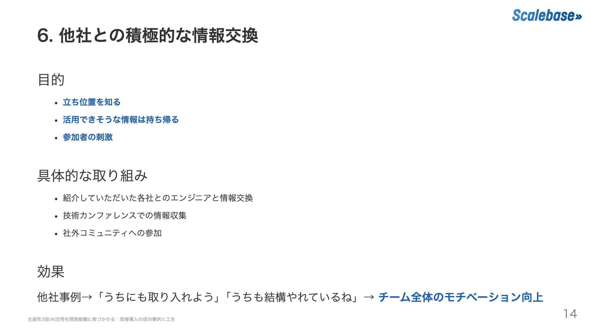 効果 他社事例→「うちにも取り入れよう」 「うちも結構やれているね」→ チーム全体のモチベーション向上 生産性3倍!AI活用を開発組織に根づかせる:現場導入の成功事例と工夫 14