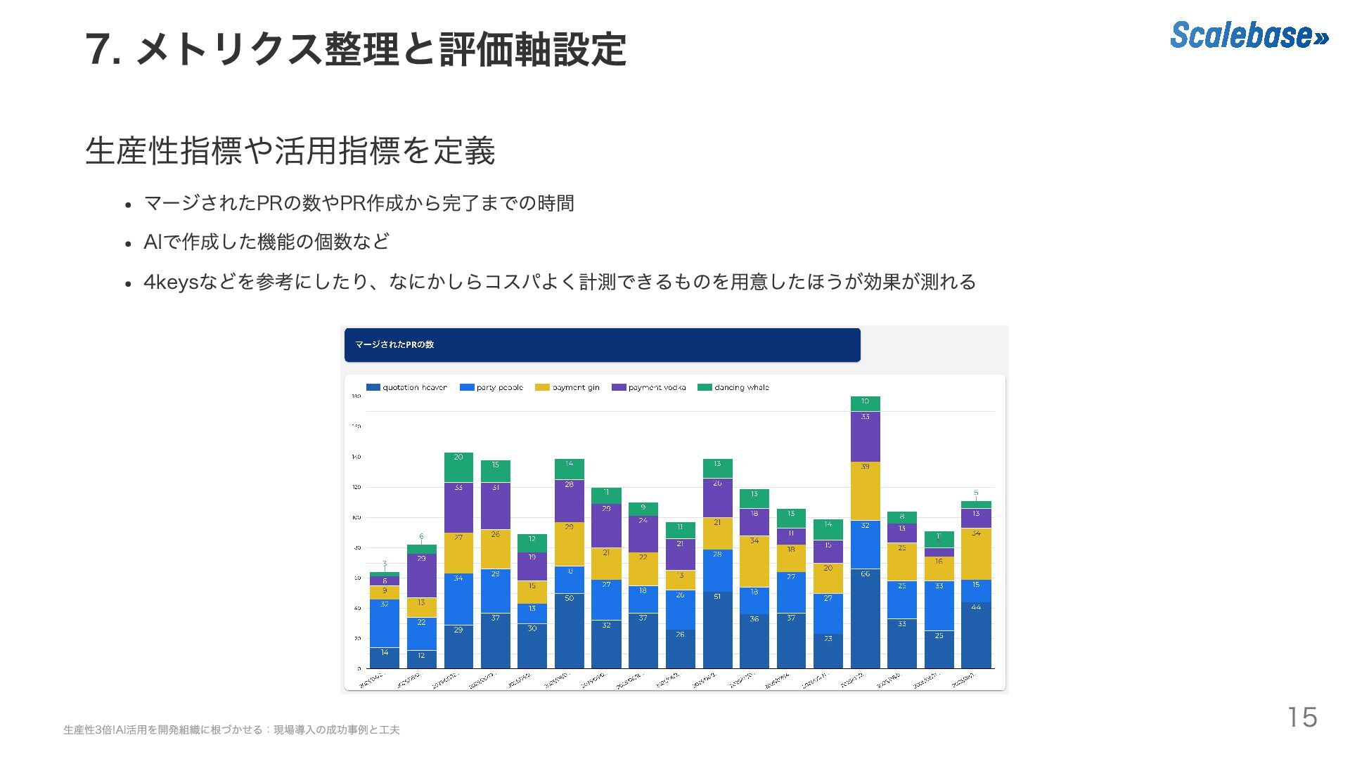 7. メトリクス整理と評価軸設定 生産性指標や活用指標を定義 マージされたPRの数やPR作成から完了までの時間 AIで作成した機能の個数など 4keysなどを参考にしたり、なにかしらコスパよく計測できるものを用意したほうが効果が測れる 生産性3倍!AI活用を開発組織に根づかせる:現場導入の成功事例と工夫 15
