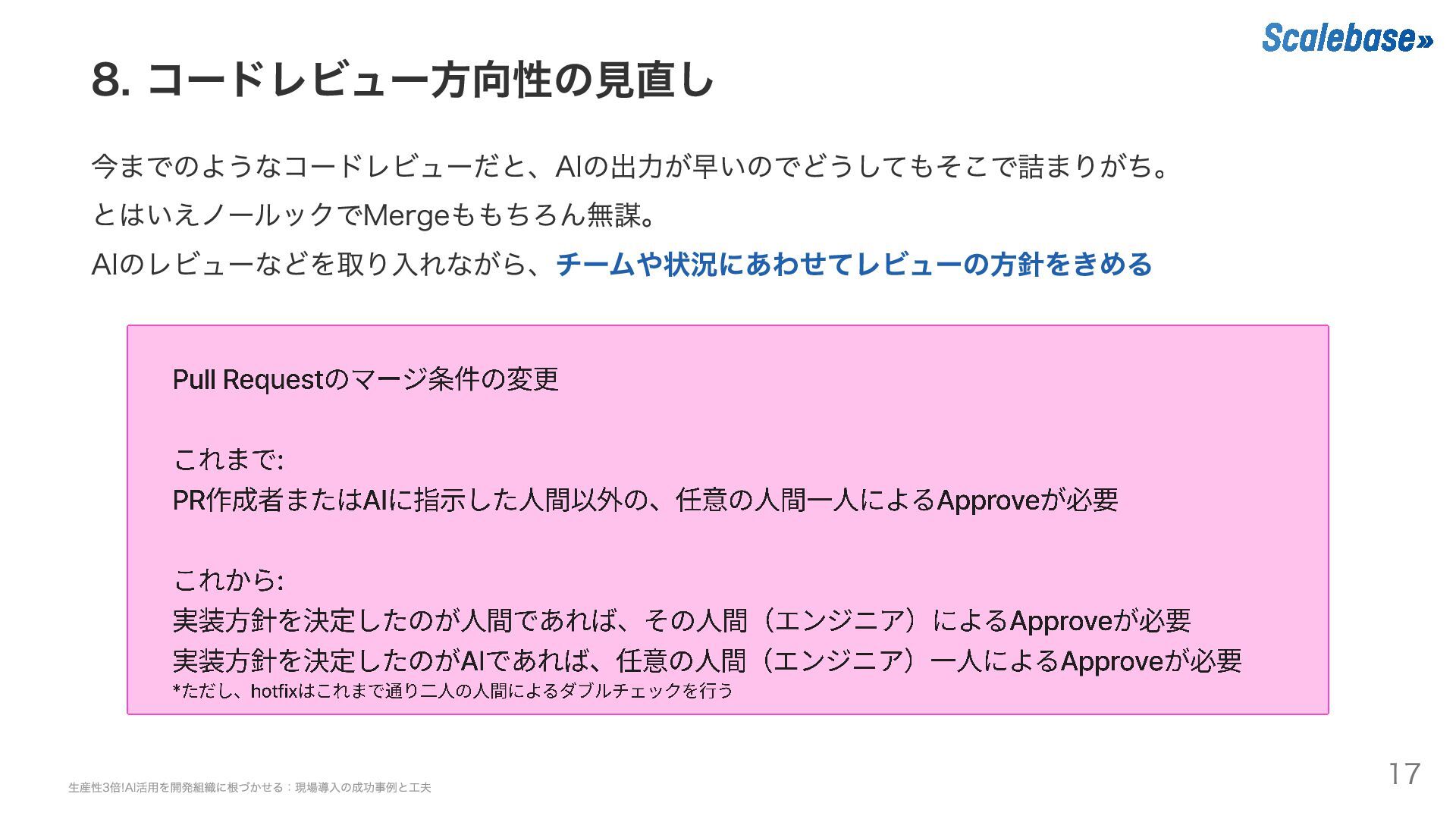 8. コードレビュー方向性の見直し 今までのようなコードレビューだと、AIの出力が早いのでどうしてもそこで詰まりがち。 とはいえノールックでMergeももちろん無謀。 AIのレビューなどを取り入れながら、チームや状況にあわせてレビューの方針をきめる 生産性3倍!AI活用を開発組織に根づかせる:現場導入の成功事例と工夫 17