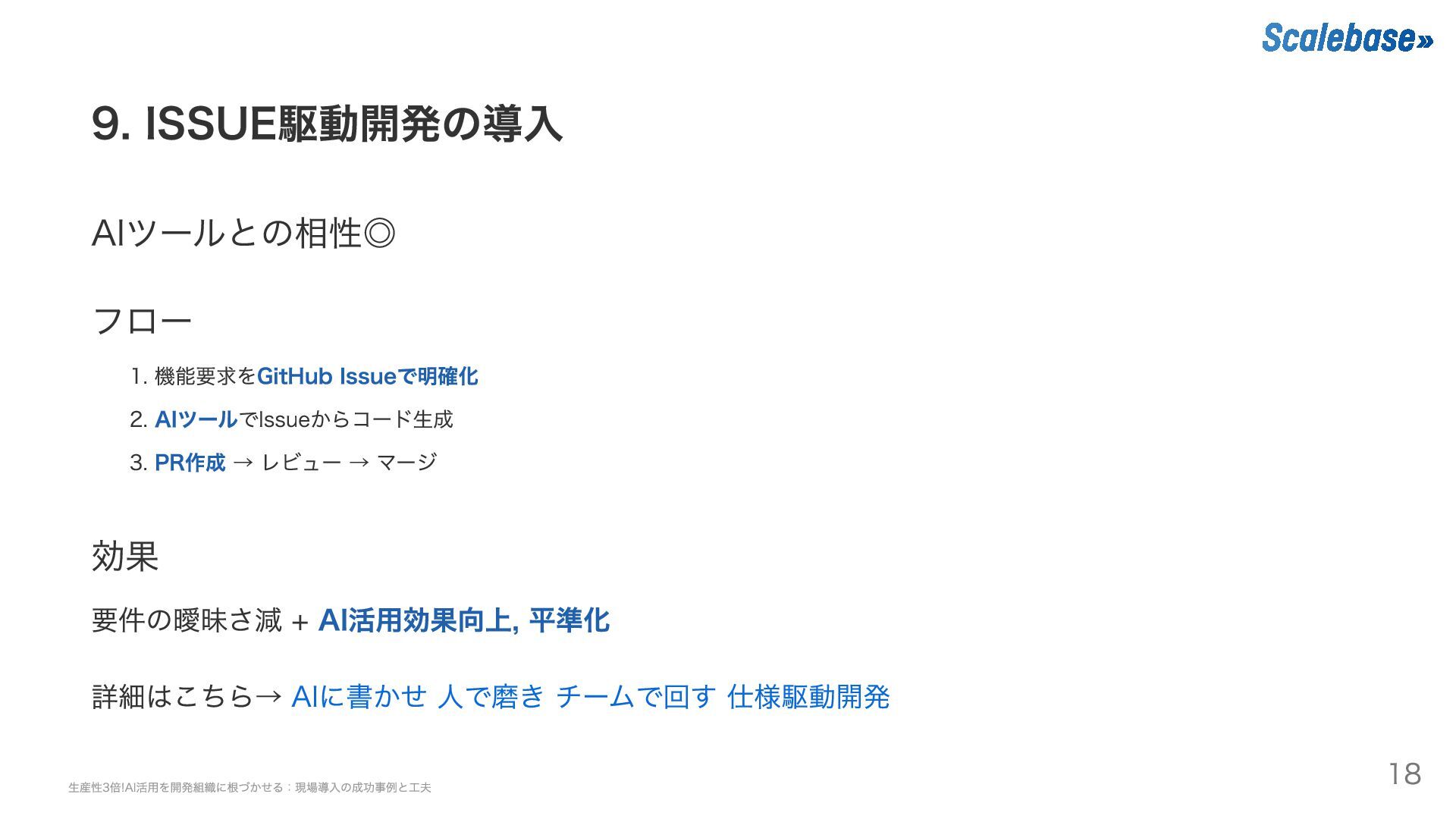 PR作成 → レビュー → マージ 効果 要件の曖昧さ減 + AI活用効果向上, 平準化 詳細はこちら→ AIに書かせ 人で磨き チームで回す 仕様駆動開発 生産性3倍!AI活用を開発組織に根づかせる:現場導入の成功事例と工夫 18