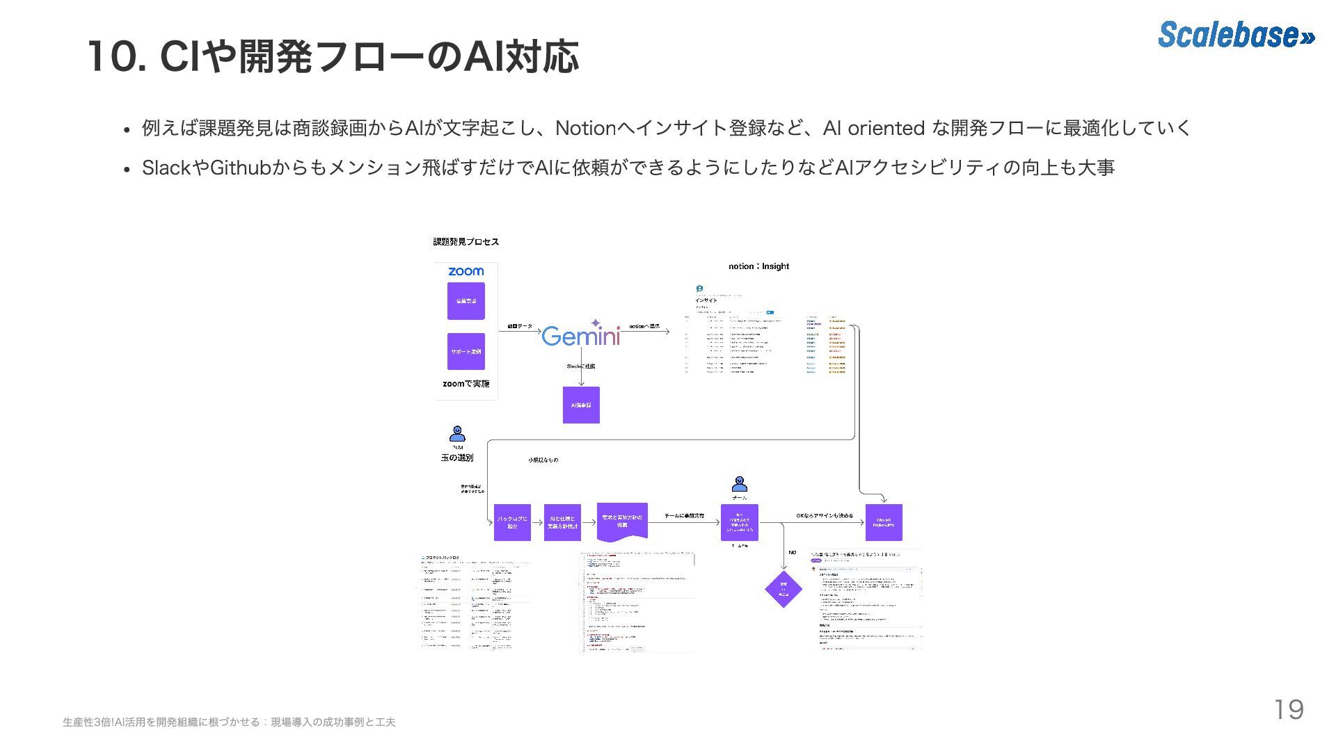 10. CIや開発フローのAI対応 例えば課題発見は商談録画からAIが文字起こし、Notionへインサイト登録など、AI oriented な開発フローに最適化していく SlackやGithubからもメンション飛ばすだけでAIに依頼ができるようにしたりなどAIアクセシビリティの向上も大事 生産性3倍!AI活用を開発組織に根づかせる:現場導入の成功事例と工夫 19