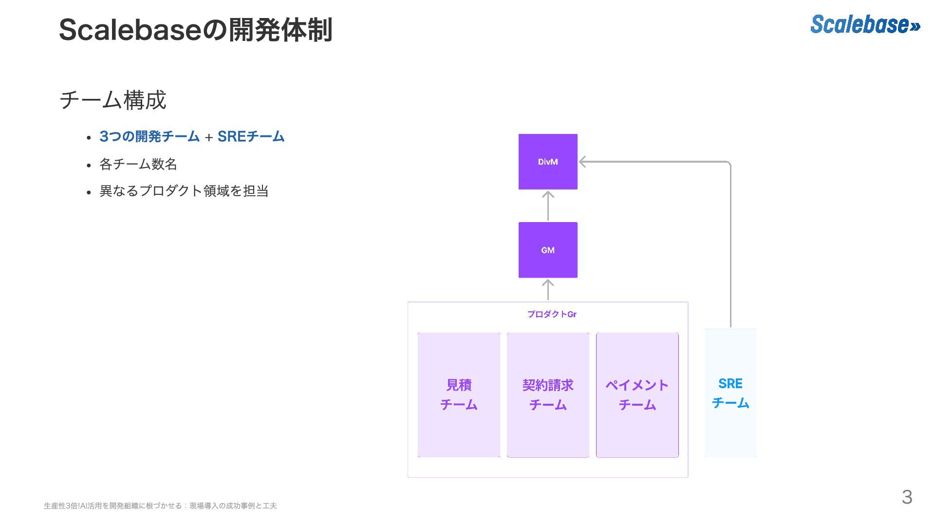 Scalebaseの開発体制 チーム構成 3つの開発チーム + SREチーム 各チーム数名 異なるプロダクト領域を担当 生産性3倍!AI活用を開発組織に根づかせる:現場導入の成功事例と工夫 3