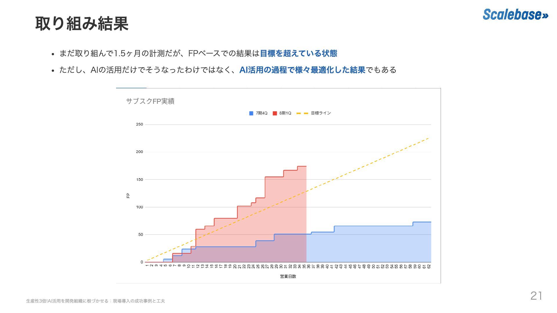 取り組み結果 まだ取り組んで1.5ヶ月の計測だが、FPベースでの結果は目標を超えている状態 ただし、AIの活用だけでそうなったわけではなく、AI活用の過程で様々最適化した結果でもある 生産性3倍!AI活用を開発組織に根づかせる:現場導入の成功事例と工夫 21