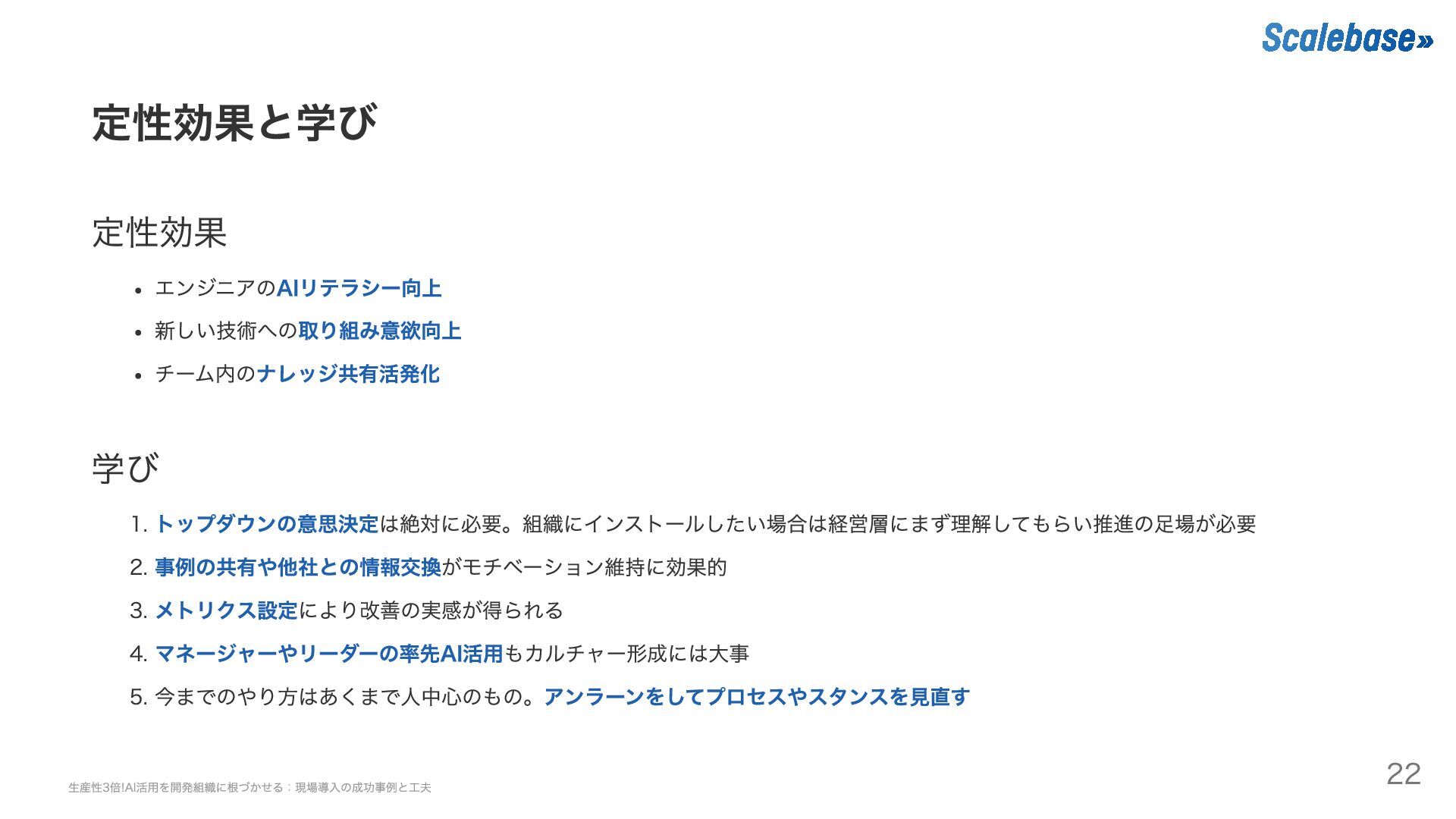 3. メトリクス設定により改善の実感が得られる 4. マネージャーやリーダーの率先AI活用もカルチャー形成には大事 5. 今までのやり方はあくまで人中心のもの。アンラーンをしてプロセスやスタンスを見直す 生産性3倍!AI活用を開発組織に根づかせる:現場導入の成功事例と工夫 22