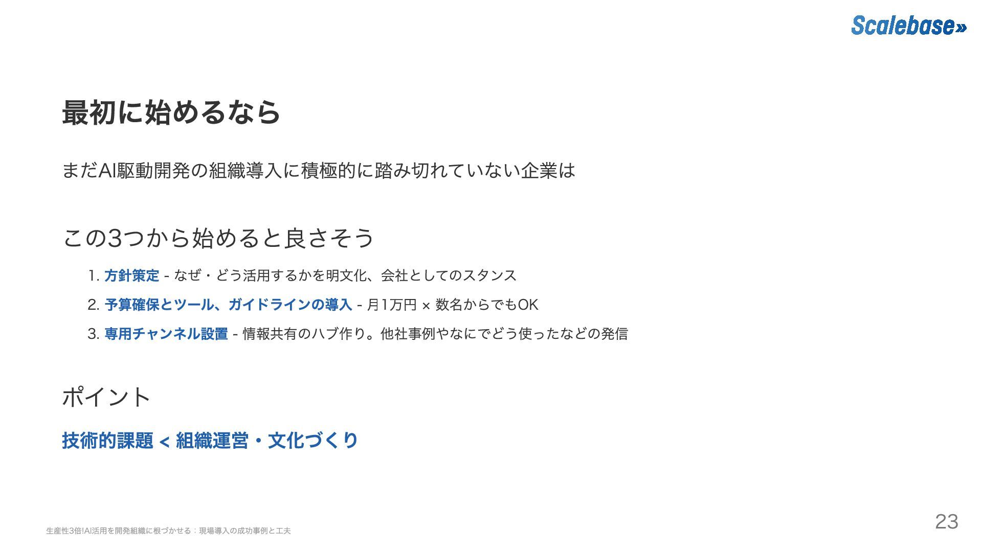 最初に始めるなら まだAI駆動開発の組織導入に積極的に踏み切れていない企業は この3つから始めると良さそう 1. 方針策定 - なぜ・どう活用するかを明文化、会社としてのスタンス 2. 予算確保とツール、ガイドラインの導入 -