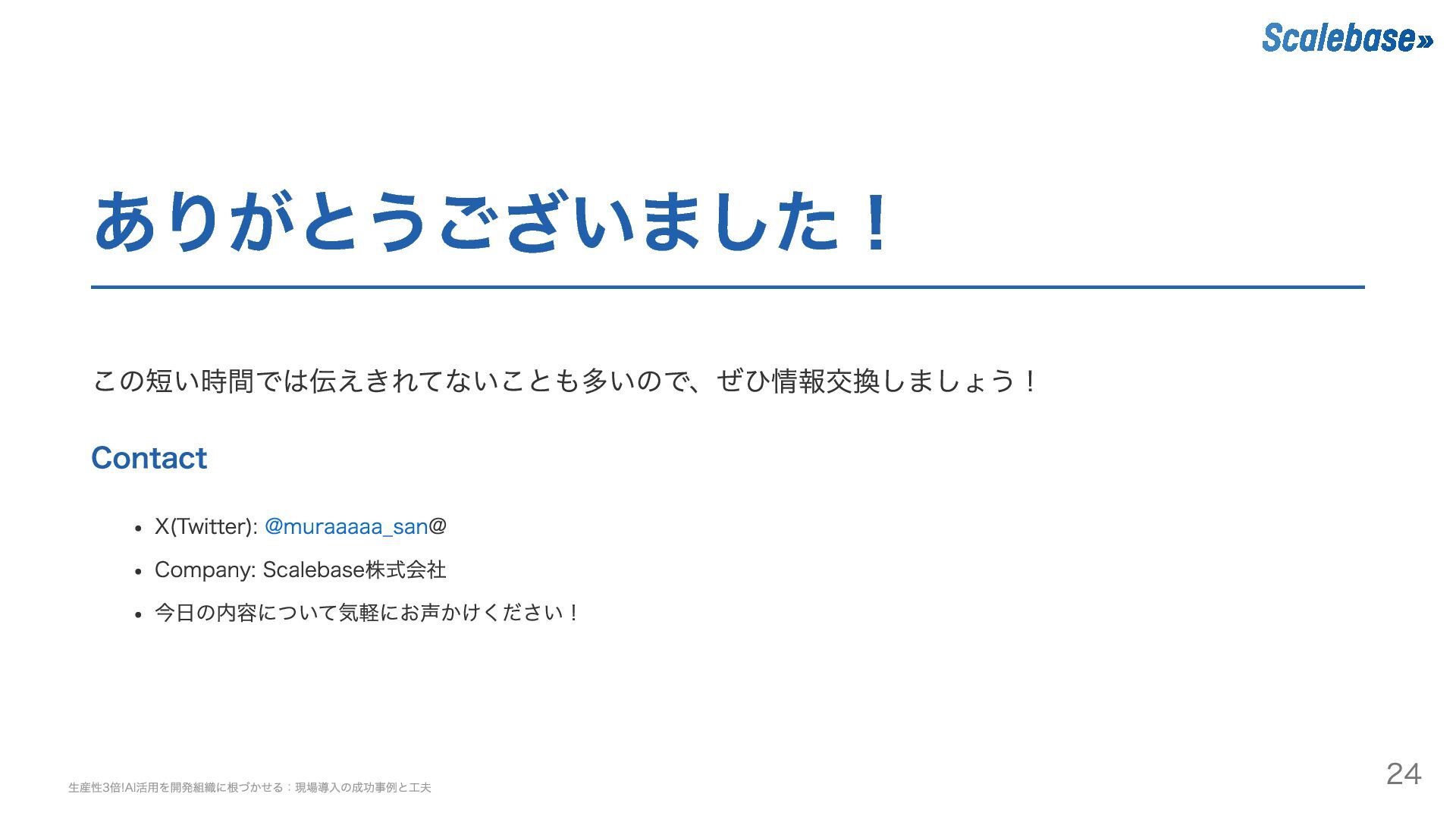ありがとうございました! この短い時間では伝えきれてないことも多いので、ぜひ情報交換しましょう! Contact X(Twitter): @muraaaaa_san@ Company: Scalebase株式会社 今日の内容について気軽にお声かけください! 生産性3倍!AI活用を開発組織に根づかせる:現場導入の成功事例と工夫 24