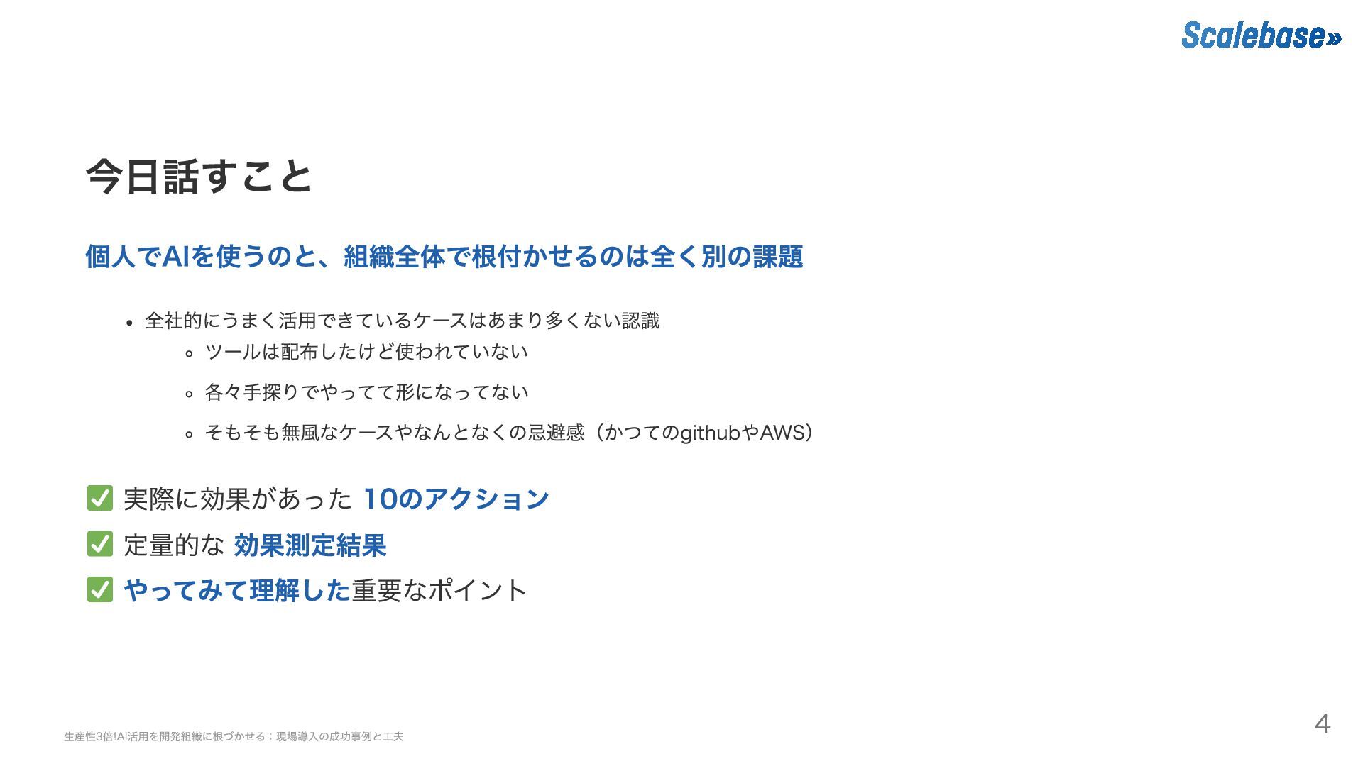 やってみて理解した重要なポイント 生産性3倍!AI活用を開発組織に根づかせる:現場導入の成功事例と工夫 4