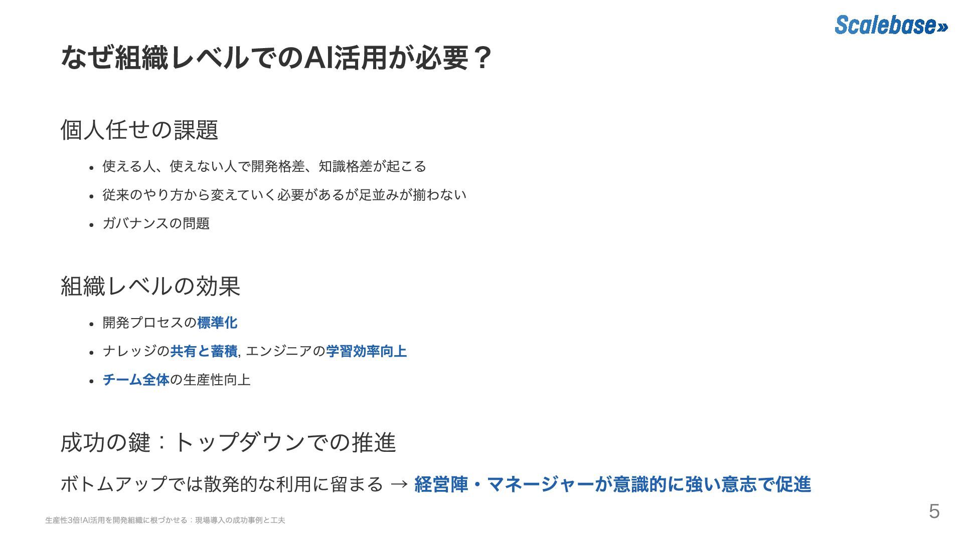 成功の鍵:トップダウンでの推進 ボトムアップでは散発的な利用に留まる → 経営陣・マネージャーが意識的に強い意志で促進 生産性3倍!AI活用を開発組織に根づかせる:現場導入の成功事例と工夫 5