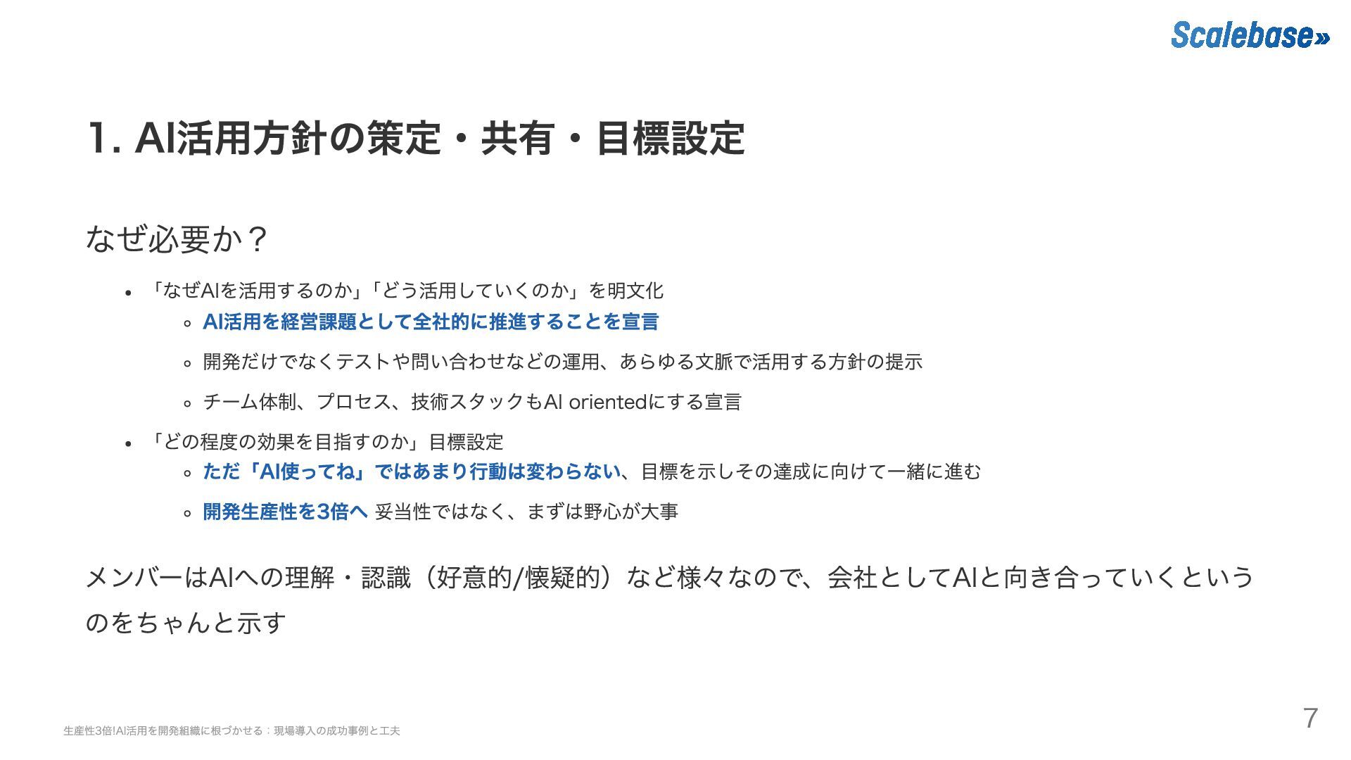 1. AI活用方針の策定・共有・目標設定 なぜ必要か? 「なぜAIを活用するのか」 「どう活用していくのか」を明文化 AI活用を経営課題として全社的に推進することを宣言 開発だけでなくテストや問い合わせなどの運用、あらゆる文脈で活用する方針の提示 チーム体制、プロセス、技術スタックもAI orientedにする宣言 「どの程度の効果を目指すのか」目標設定